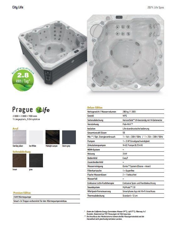 Erleben Sie den energiesparenden Whirlpool Wellis Prague Life mit 1 Liegeplatz, 5 Sitzplätzen, 50 Düsen und LED-Beleuchtung. Genießen Sie eine luxuriöse Entspannung mit Massagefunktion, Soundsystem und Smartphone-Steuerung. Perfekt für Garten oder Terrasse.