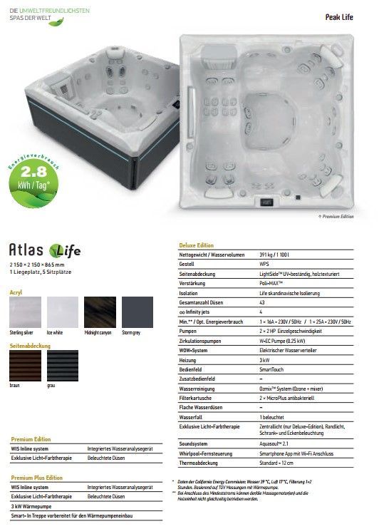 Wellis Peaklife Whirlpool Atlas Life Premium 6 Personen 215 x 215 x 86 cm 43 Düsen