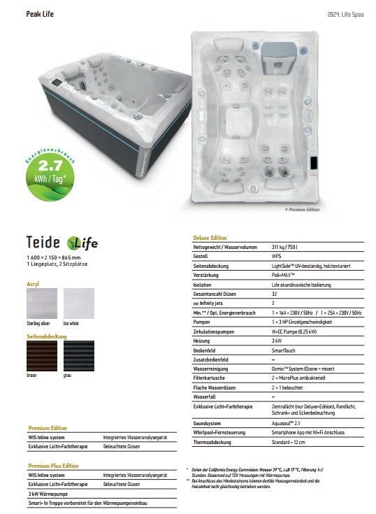 Wellis Peaklife Whirlpool Teide Life Premium 3 Personen 160 x 215 x 86 cm 32 Düsen