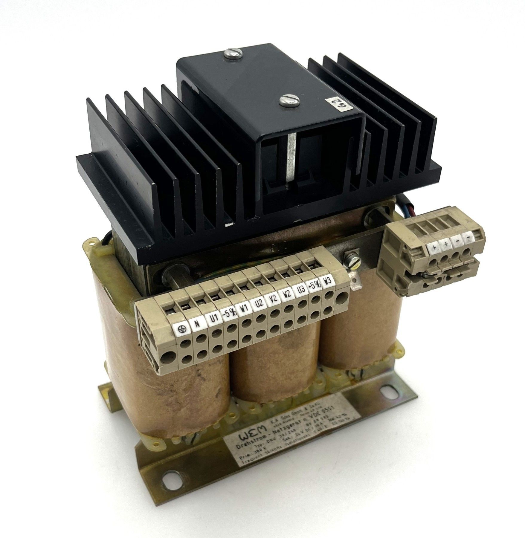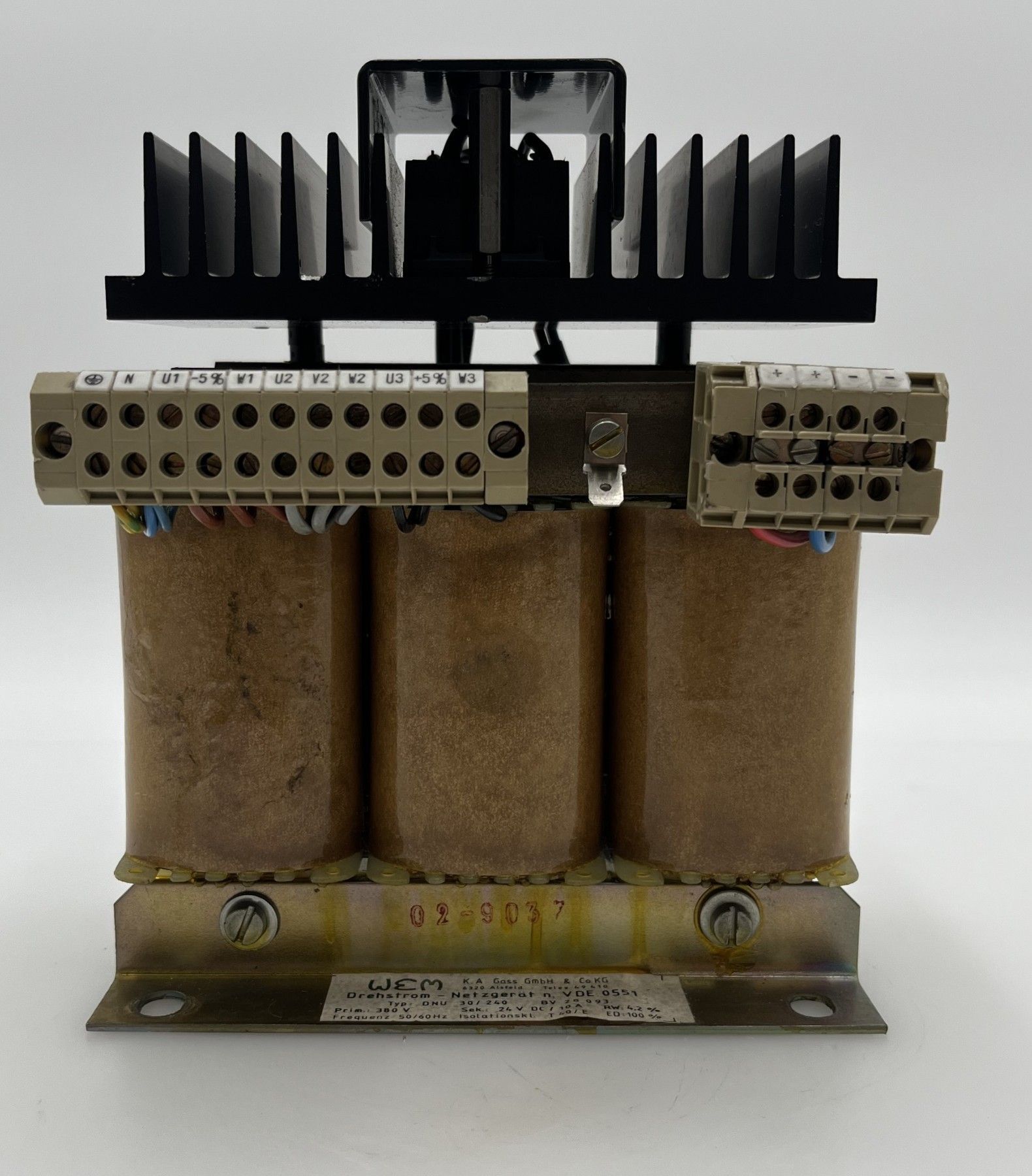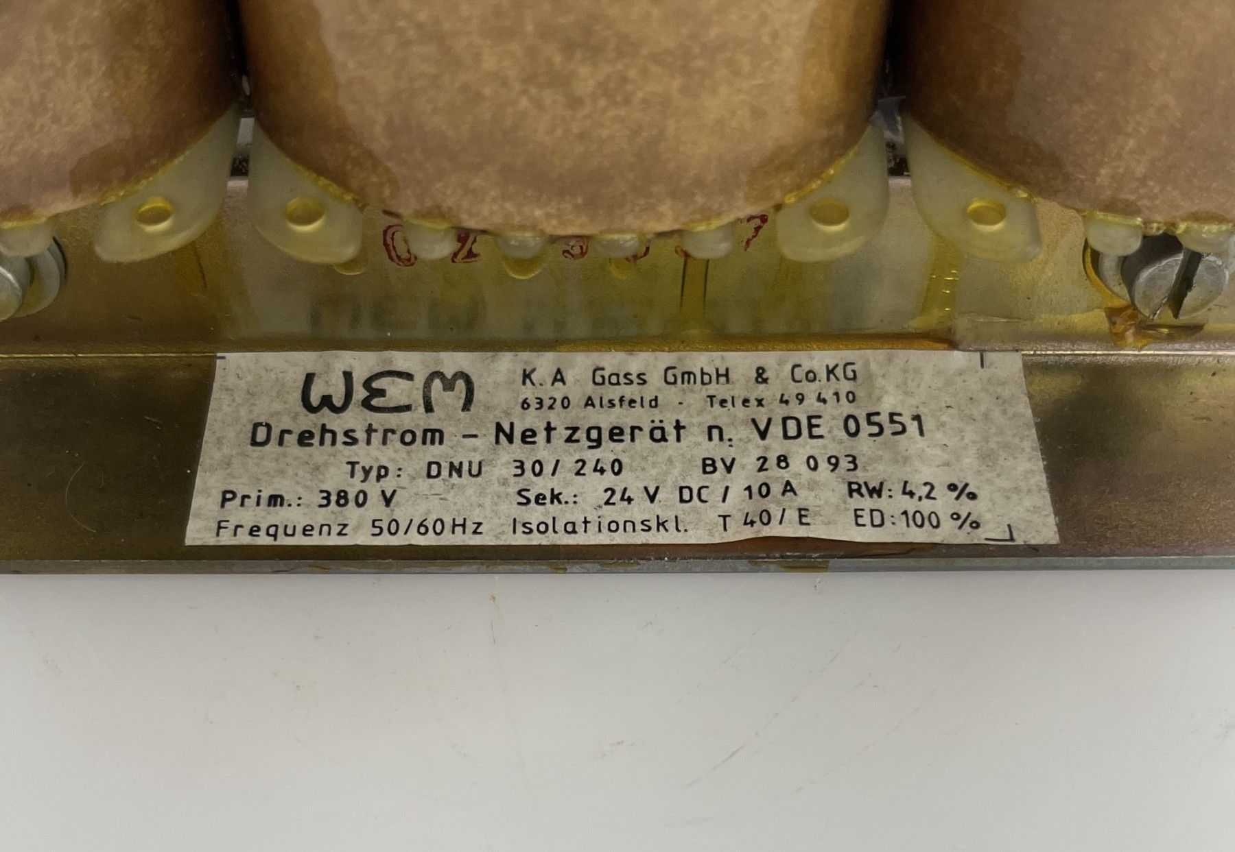 WEM K.A. Gass Transformator DNU 30 240 Trafo Netzgerät pri. 3 x 380 V sec. 24 V DC sec. 10 A Maße L x B x H: 115 x 150 x 185 mm Gewicht: 6,1 kg BV 28 093 Hergestellt nach VDE 0551 Zustand: neuwertig (war noch nie eingebaut) Unsere Artikelnummer: T9 1028 Sicherheitsprüfung nach VDE durchgeführt Sie e