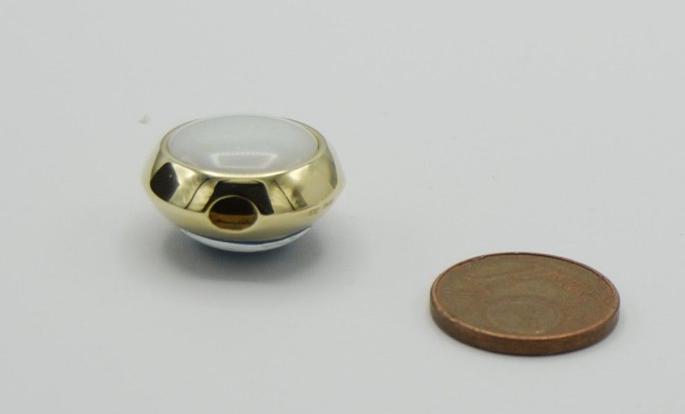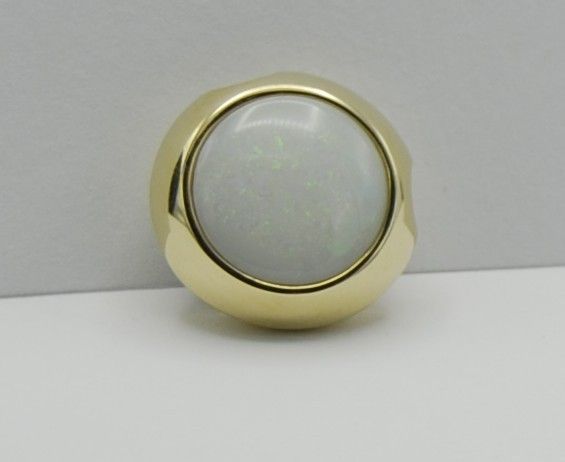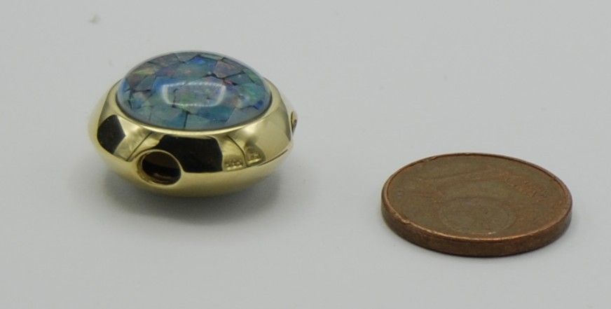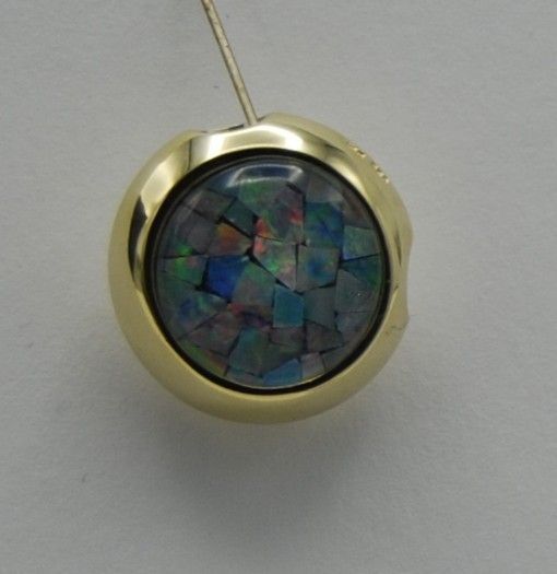 Der Anhänger wiegt 6 Gramm. Er hat einen Durchmesser von 1,8 cm. Auf der einen Seite ist ein Mosaik Opal und auf der anderen ein Milchopal. Der Anhänger ist 585 gestempelt.