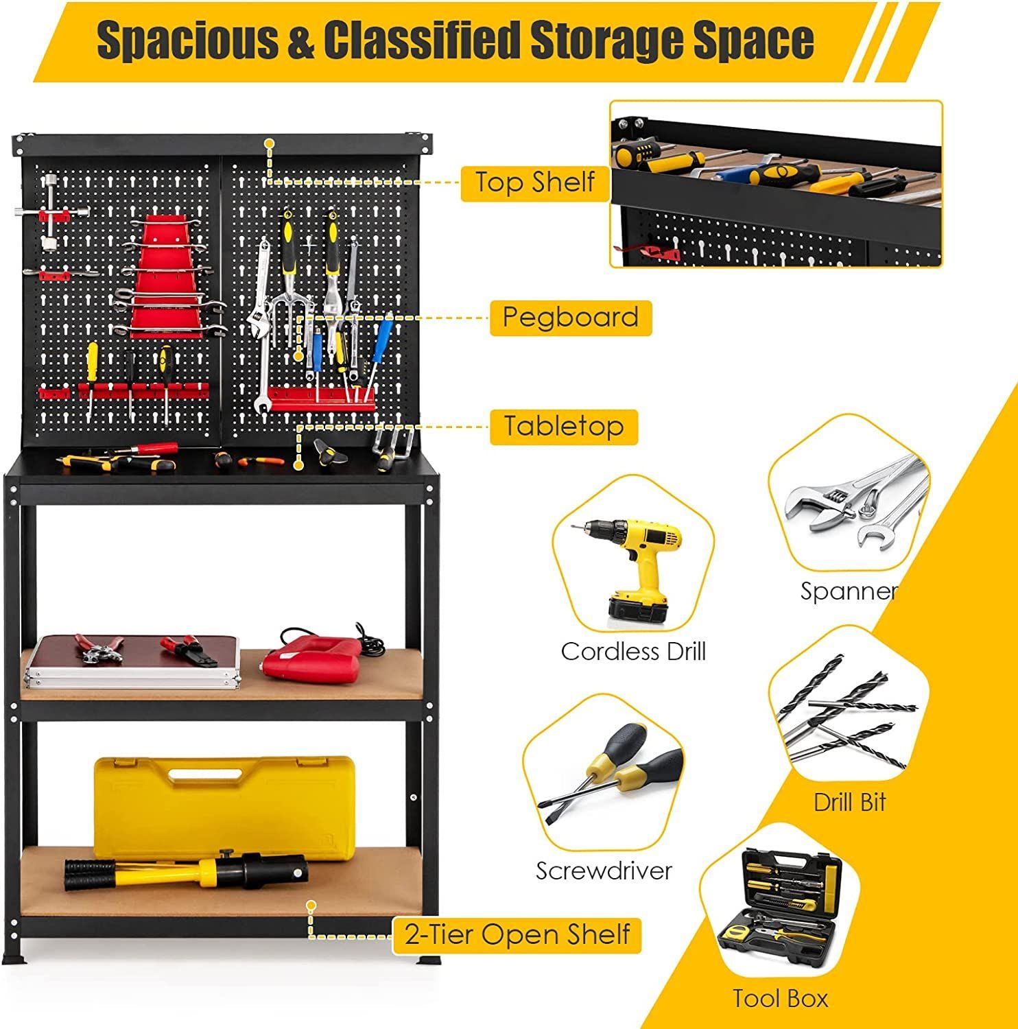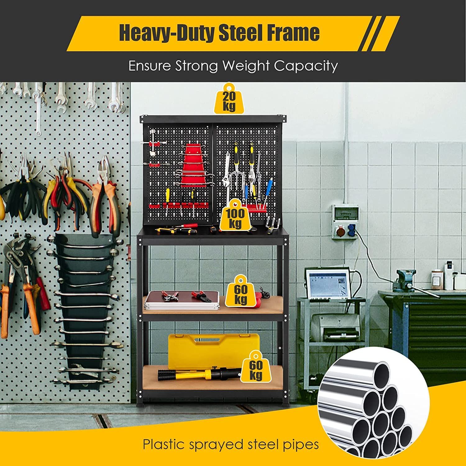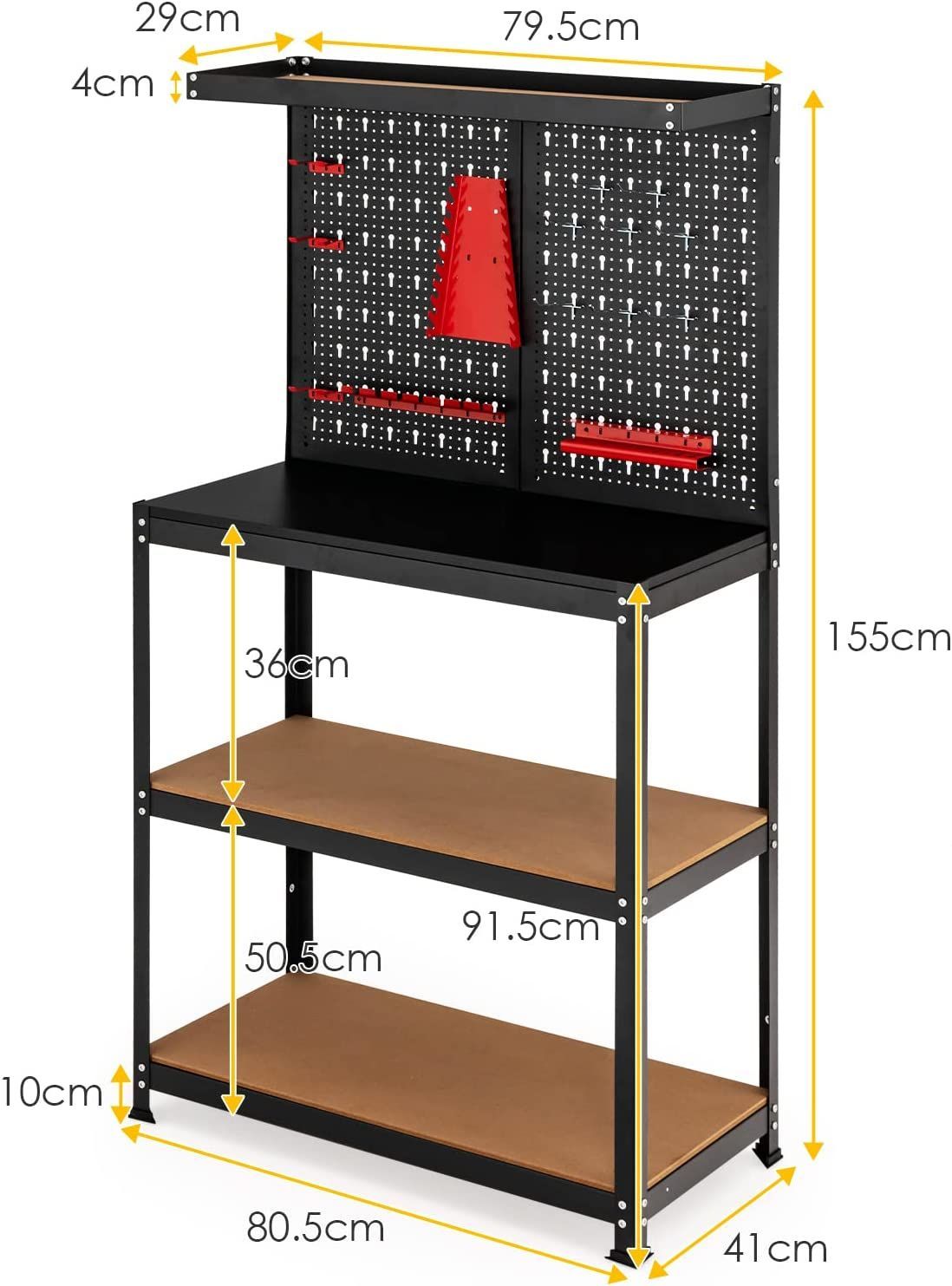 Werkbank mit Lochwand & 2 unteren Ablagen, Werktisch zur Werkzeugaufbewahrung
