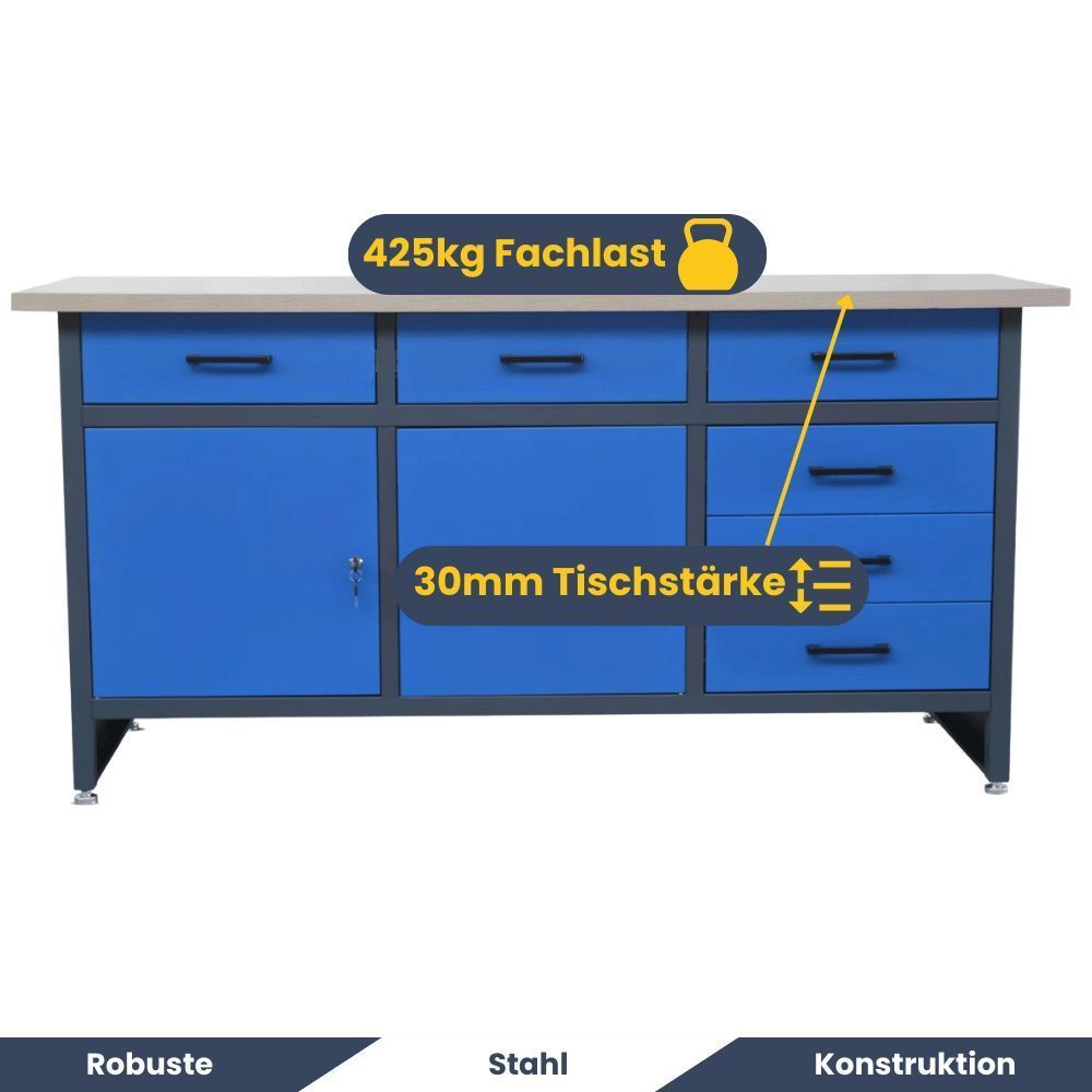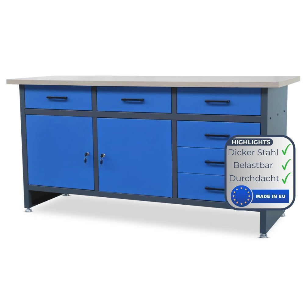 Werkbank Werkstatt KARL 85x170x60cm Anthrazit-Blau 6 Schubladen 2x Schließfach