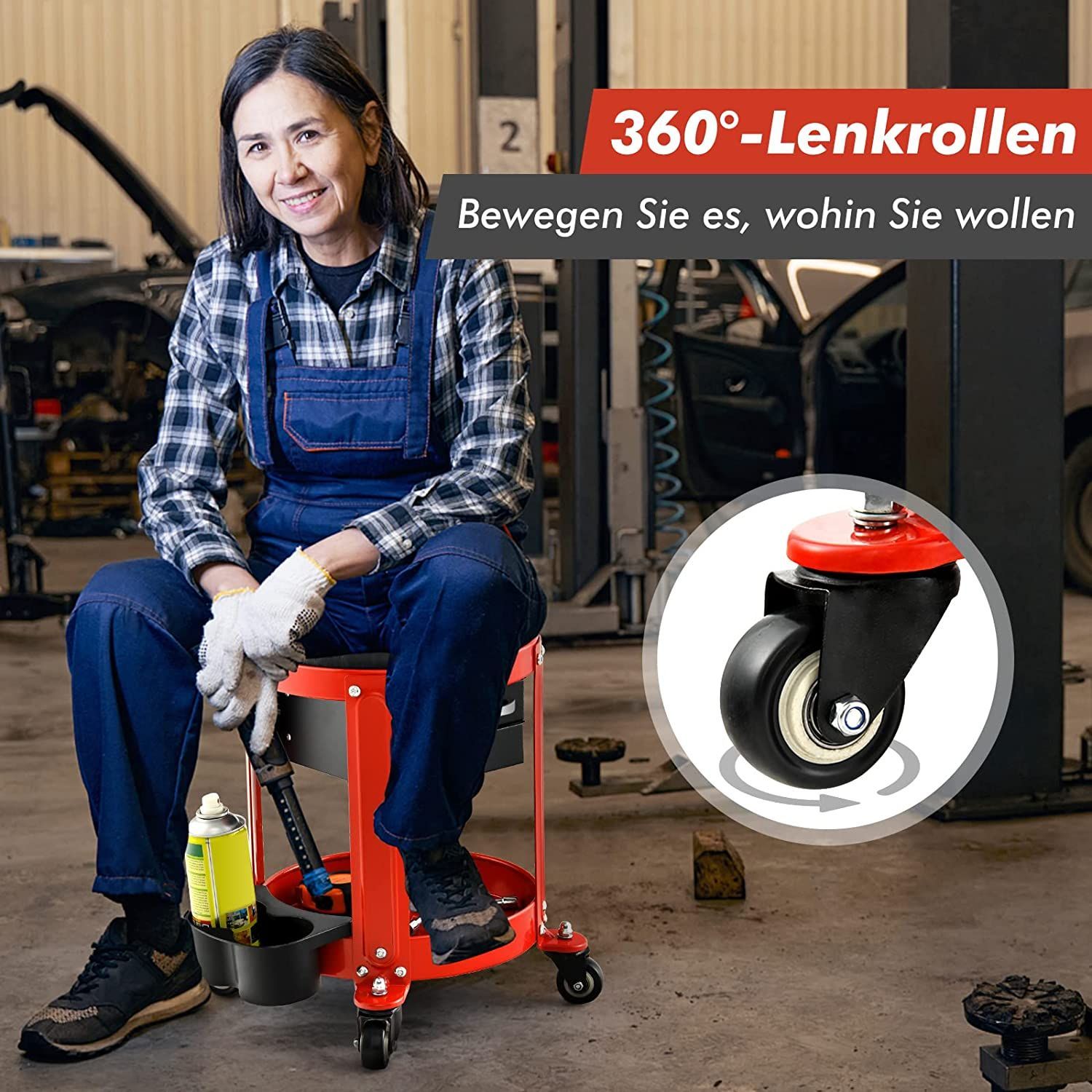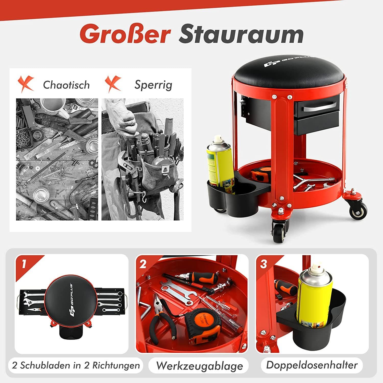 Werkstatthocker, Werkstattsitz mit 2 Schubladen & Dosenhaltern & Ablage, Arbeitshocke