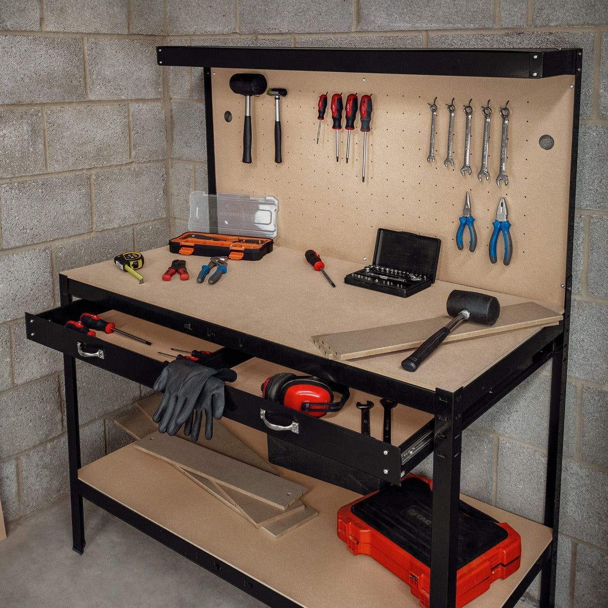 Werktsich Werkbank Arbeitstisch Schwarz Werkstatt Lochwand Schublade Licht DIY