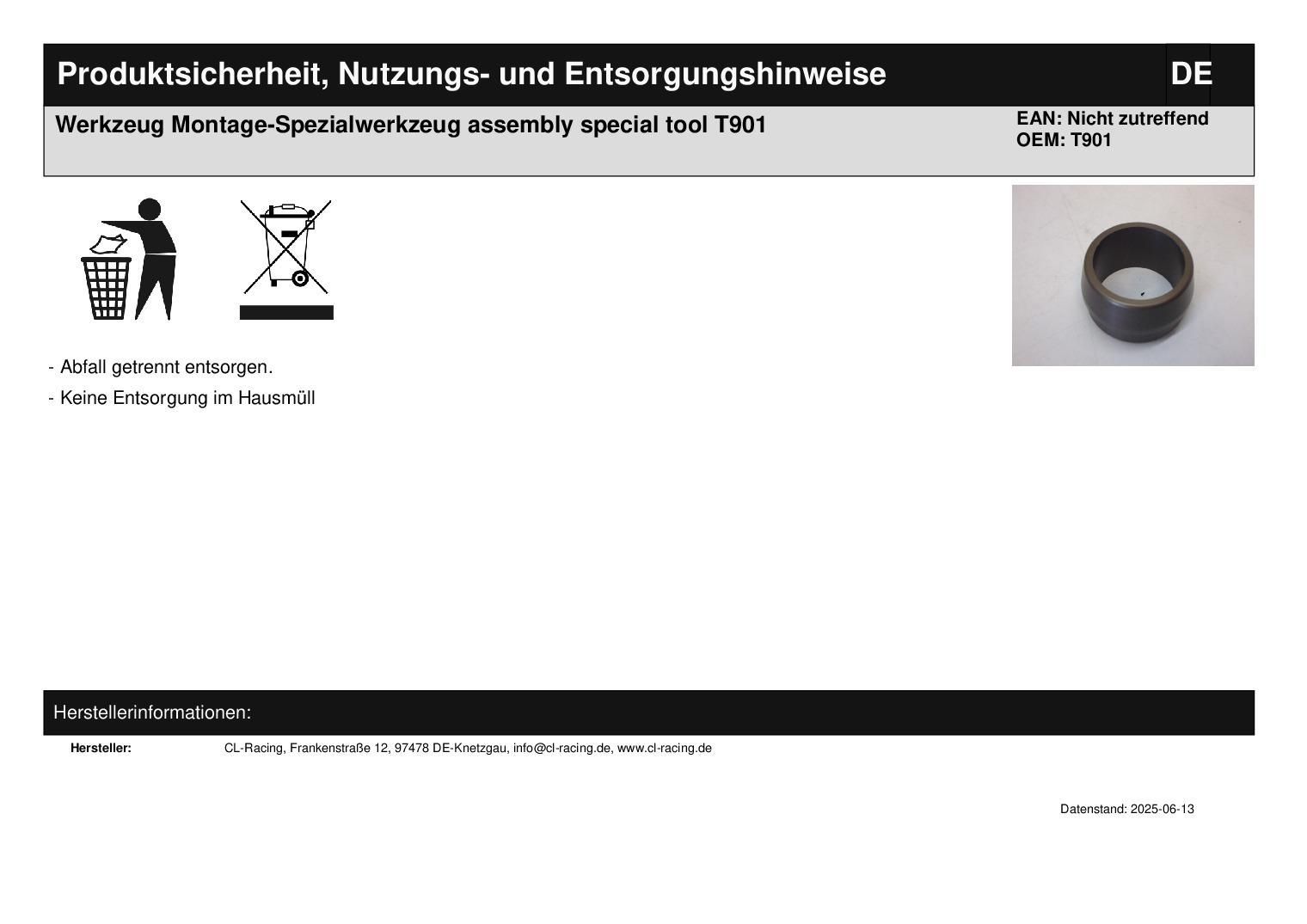 Werkzeug Montage-Spezialwerkzeug assembly special tool T901 In dieser Auktion gibt es folgenden Artikel zu kaufen: Montage-Spezialwerkzeug (siehe Foto) Modell: unbekannt Bj.: unbekannt Lieferumfang: 1 Stück Artikelzustand: neu aus Geschäftsauflösung, mit minimalen Lagerspuren; Zustand siehe Foto Bei