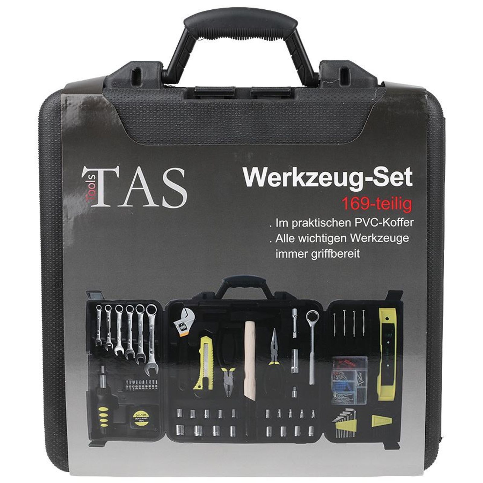 - umfasst alle wichtigen Werkzeuge wie 1 Hammer, 1 Ratschen-Ringmaulschlüssel-Set, 1 Bit-Set, 1 Maßband, 1 Cuttermesser, 1 Mini-Wasserwaage, 2 verschiedene Zangen, 1 Innensechskant-Set, 1 Torx-Schlüssel-Satz, 1 Präzisions-Schraubendreher-Set, 1 Engländer, 1 Steckschlüsselsatz mit Knarren und verschiedenen Verlängerungen, sowie diverse Dübel, Schrauben, Nägel, uvm.