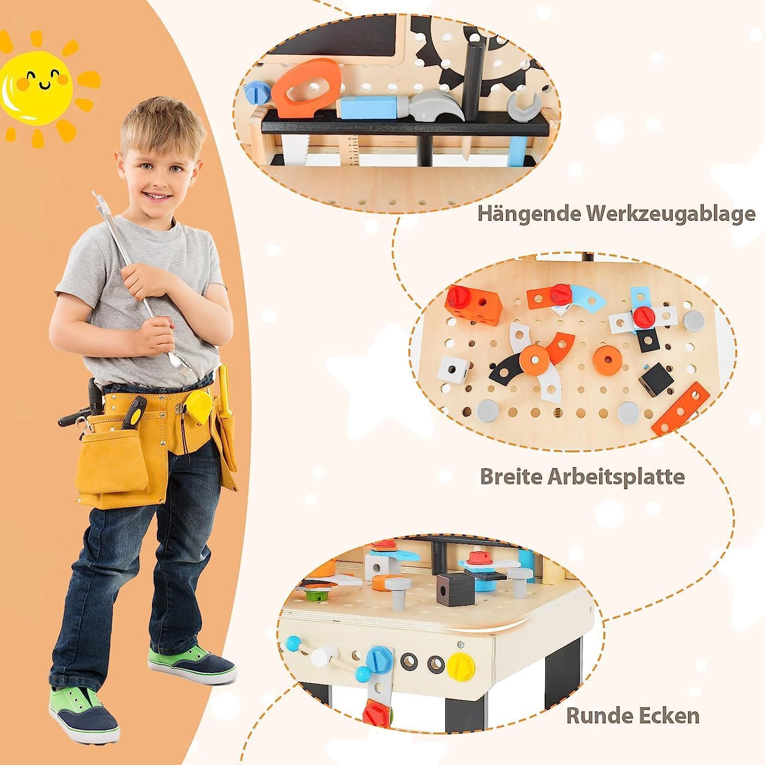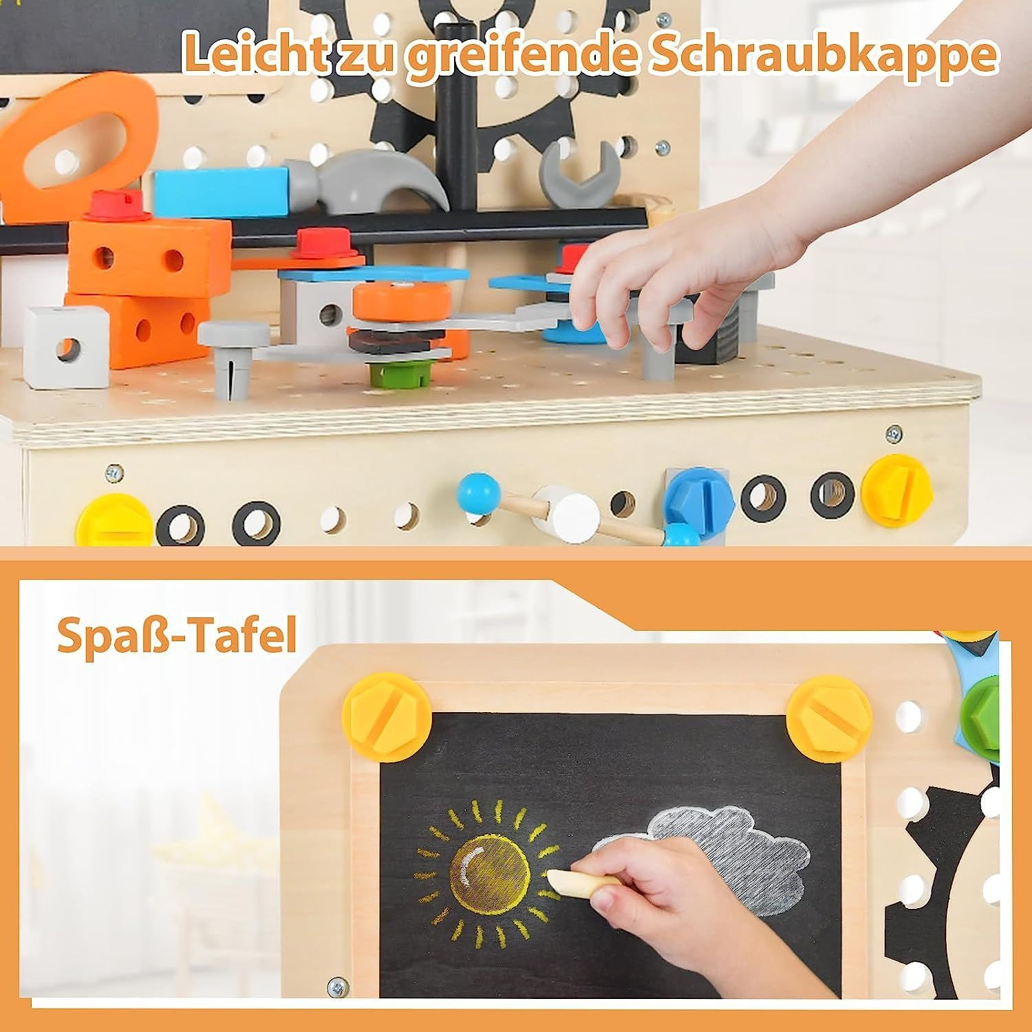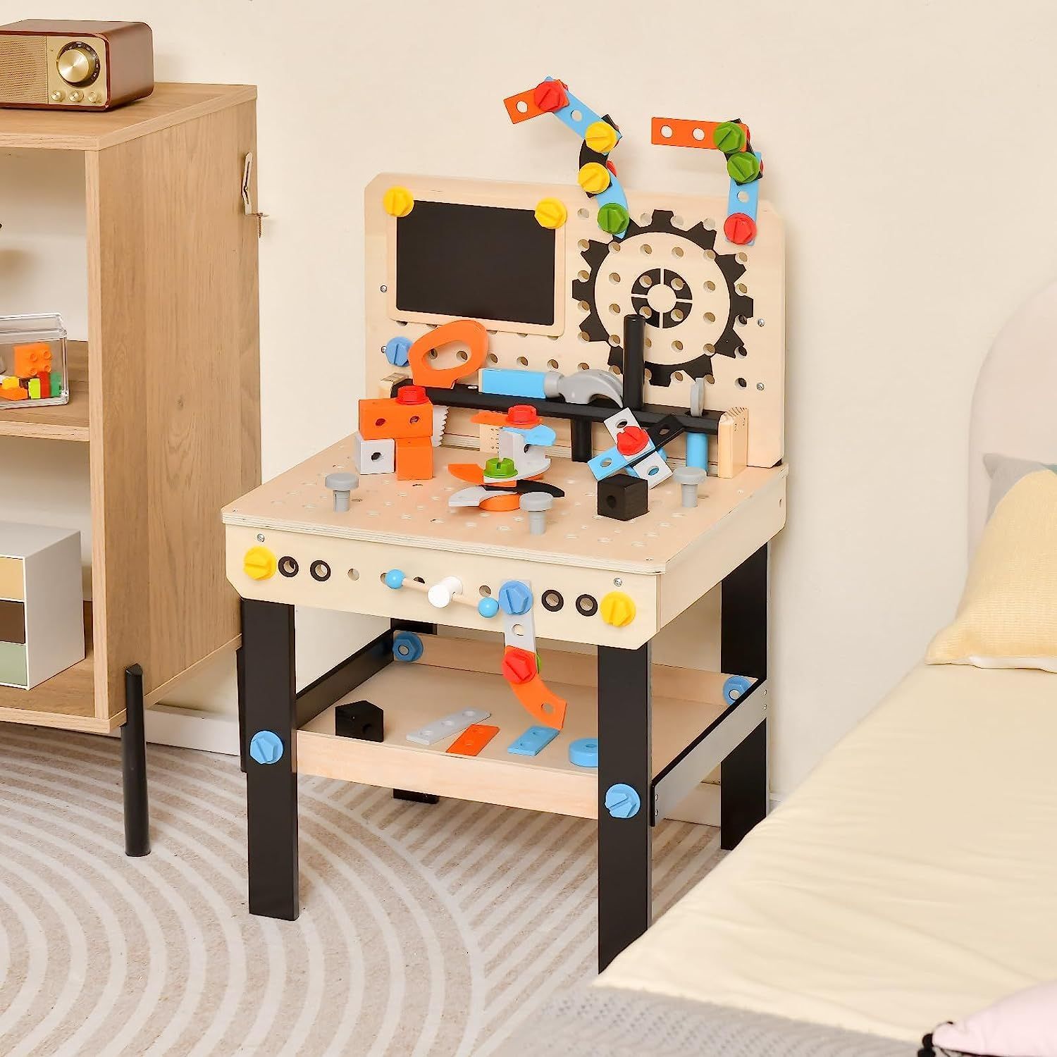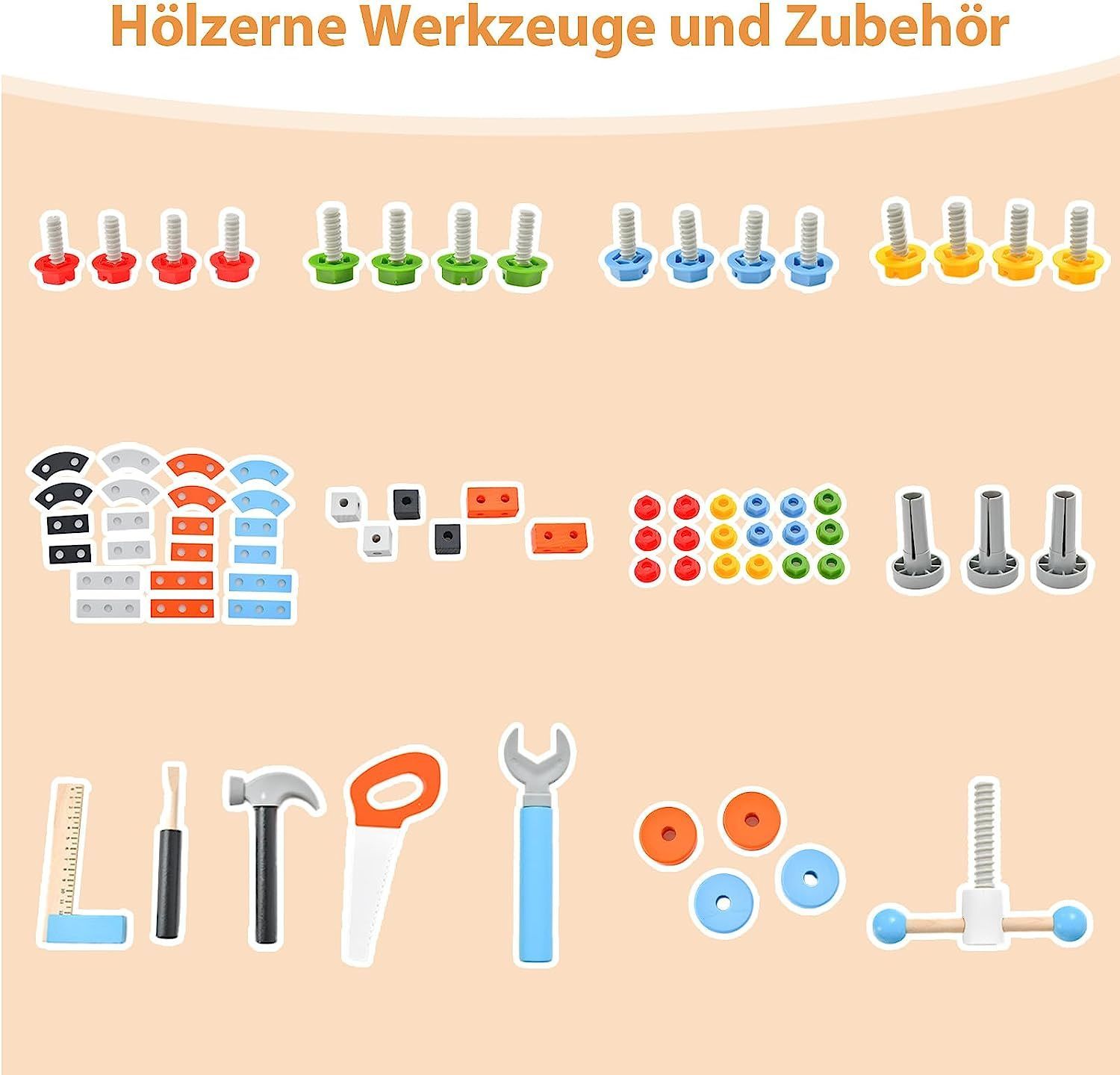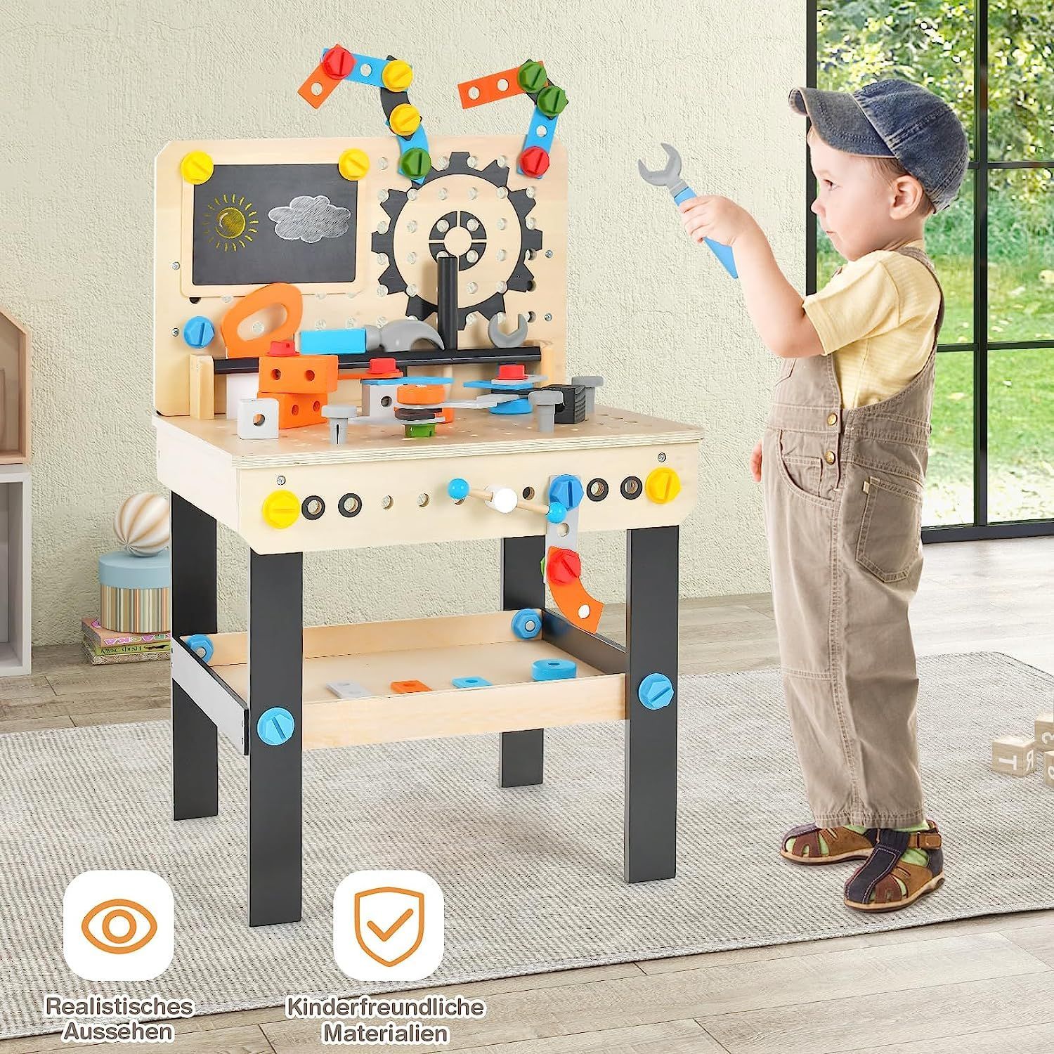 Werkzeugbank für Kinder, Werkbank Holz mit Tafel, hängendem Werkzeugständer & Zubehör