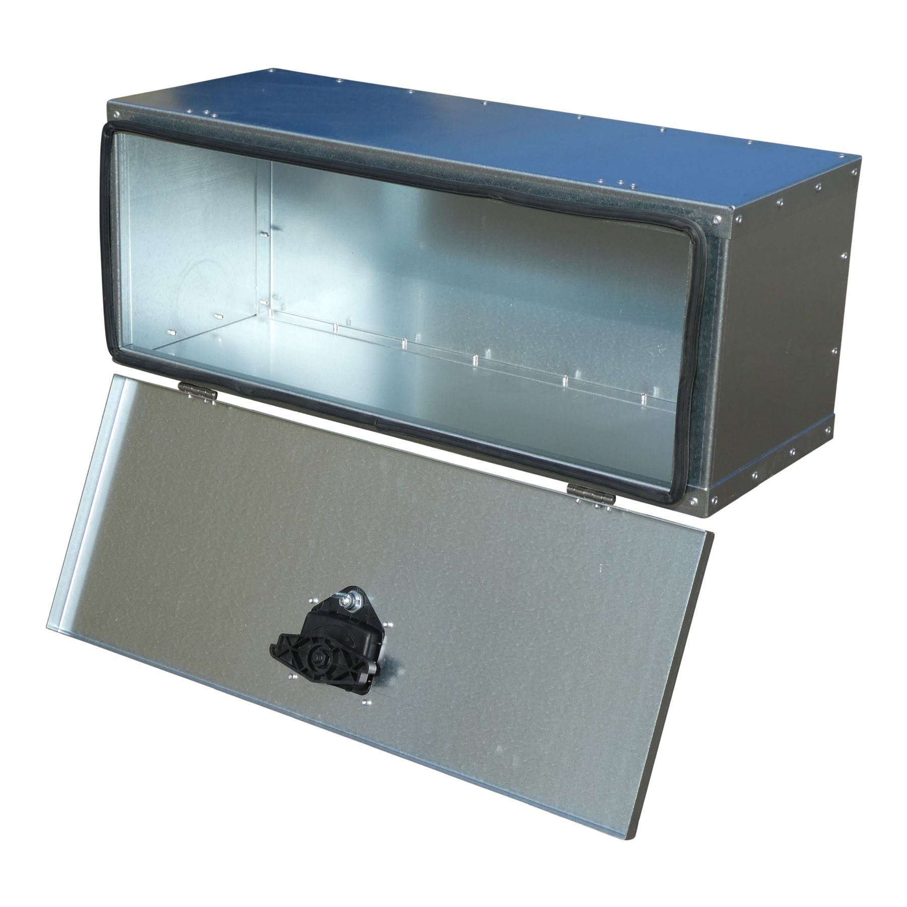 Werkzeugkasten aus verzinktem Blech 1,5 mm mit Gummidichtung Kunststoffverschluss, abschließbar Edelstahl Scharniere Edelstahl Nieten Abbildung ähnlich dieser Kasten z.B. ist nicht für den Einbau feuchtigkeitsempfindlicher Geräte geeignet