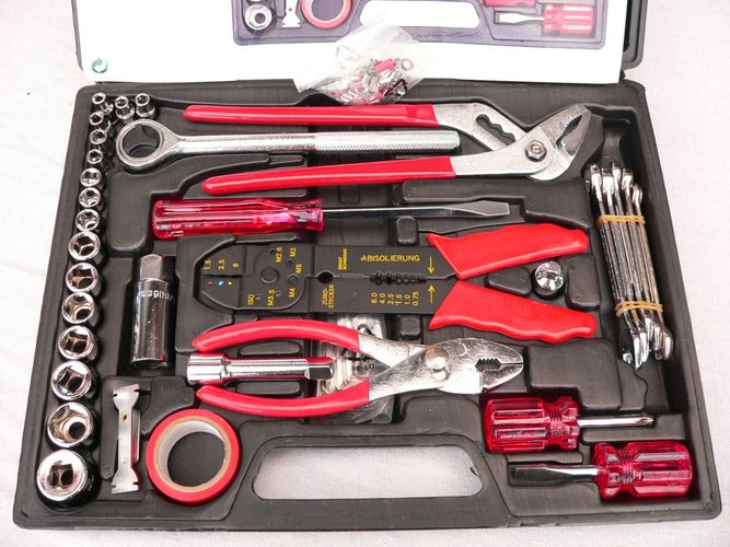 Hab noch diverse neue Werkzeugkoffer von Pacini. Universal-Ausstattung für kleinere Reparaturen und Möbelaufbau. Sie sind alle neu und unbenutzt, original verpackt. Besonders gut für den Zusammenbau von Ikea Möbeln geeignet. Koffermaß: 36x26x4cm Inhalt 69Teile, siehe Bilder Preis 16,95 Euro pro Koff
