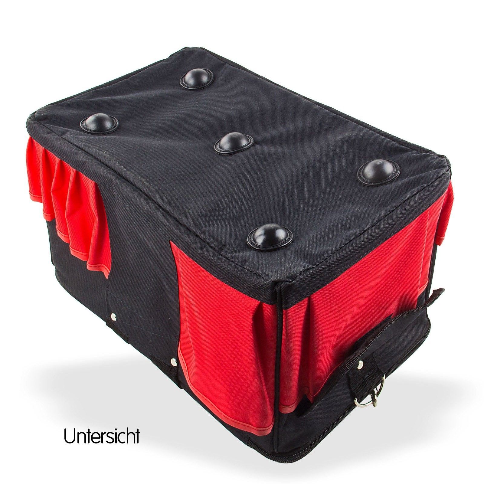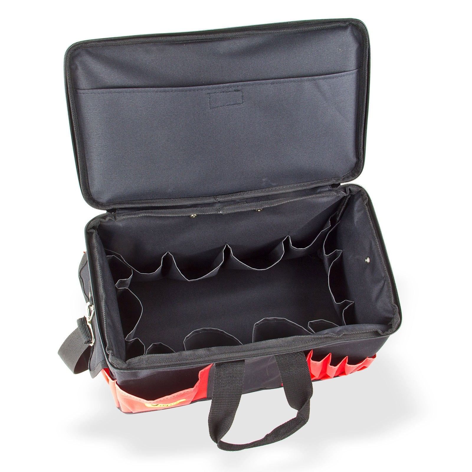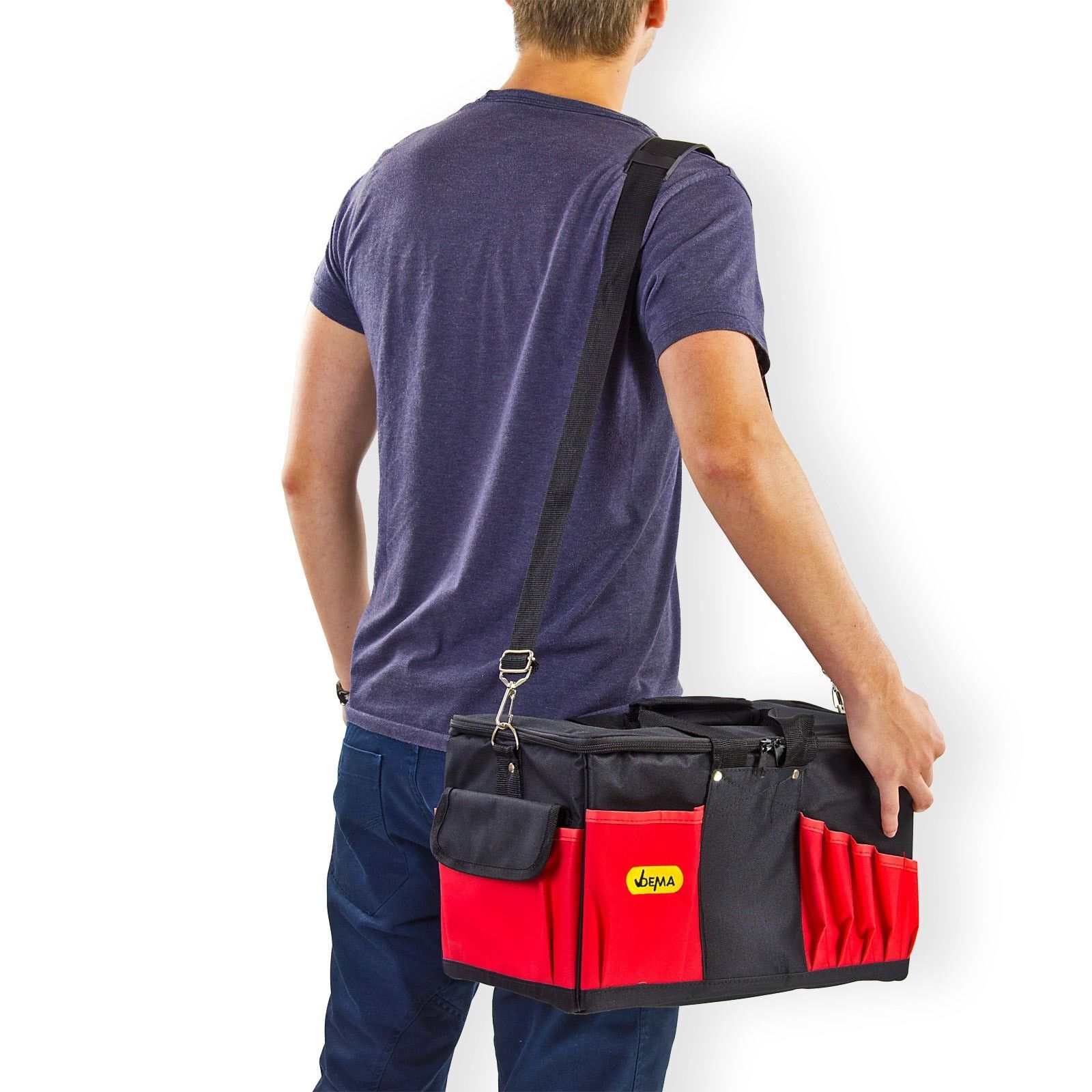 DEMA Werkzeugtasche / Montagetasche mit 14 Fächern – robust, geräumig und ideal für unterwegs Die DEMA Werkzeugtasche überzeugt durch ihre durchdachte Aufteilung, hochwertige Verarbeitung und hohe Funktionalität. Mit einem großzügigen Hauptfach, 14 Innenfächern und 14 zusätzlichen Außentaschen bietet sie ausreichend Platz für Werkzeuge und Zubehör – perfekt für den professionellen Einsatz auf Montage oder für Heimwerker mit Anspruch. Gefertigt aus widerstandsfähigem Nylon und ausgestattet mit einem gepolsterten Innenraum sowie einem verschließbaren Deckelfach, schützt die Tasche Ihre Werkzeuge zuverlässig vor Schmutz, Stößen und Witterung. Der verstellbare und abnehmbare Umhängegurt mit Karabinerverschluss ermöglicht einen bequemen und flexiblen Transport, egal ob auf der Baustelle oder in der Werkstatt. Produktmerkmale: Großes Hauptfach mit 14 integrierten Innenfächern 14 Außenfächer, teilweise mit Klettverschluss – für schnellen Zugriff Deckelfach mit Reißverschluss für zusätzliche Sicherheit Zwischenpolsterung – schützt Werkzeuge vor Stößen Strapazierfähiges Nylon – robust und langlebig Trage- und Umhängegurt – abnehmbar und längenverstellbar mit Karabinerverschluss Guter Tragekomfort – ideal für längere Einsätze Technische Daten: Außenmaße (L x B x H): 42 x 24 x 25 cm Innenmaße (L x B x H): 36 x 19 x 22,5 cm Gewicht: 1,6 kg Lieferumfang: 1x Werkzeugtasche mit Umhängegurt (Werkzeug nicht enthalten) Ob auf Montage, beim Heimwerken oder für die tägliche Werkstattarbeit – mit dieser Werkzeugtasche haben Sie Ihre Ausrüstung immer übersichtlich und sicher griffbereit!