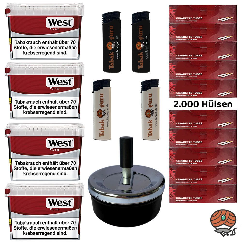 4 x West Red Rot Volumentabak Mega Box + 2.000 Filterhülsen (nicht wählbar) + 4 Feuerzeuge (nicht wählbar) + 1 Drehascher Schleuderaschenbecher (nicht wählbar) Tabak: Beim West Red Volumentabak handelt es sich um einen American Blend aus ausgewählten Virginia-, Burley- und Orienttabaken. Er zeichnet