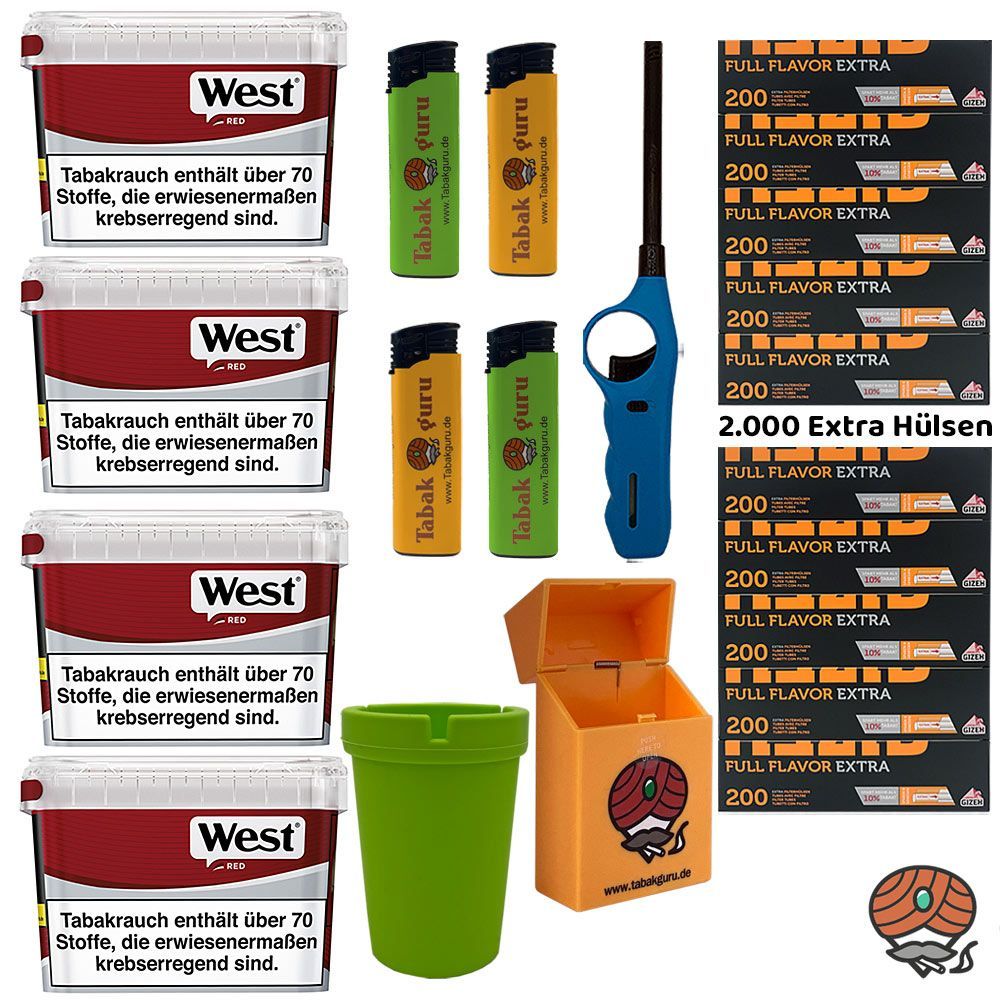 4 x West Red Rot Volumentabak Mega Box + 2.000 Gizeh Full Flavor Extra Papier-Filterhülsen + 4 Feuerzeuge (nicht wählbar) + 1 Stabfeuerzeug (nicht wählbar) + 1 Autoaschenbecher (nicht wählbar) + 1 Zigarettenbox (nicht wählbar) Tabak: Bei dem West Red Volumentabak handelt es sich um einen American Bl
