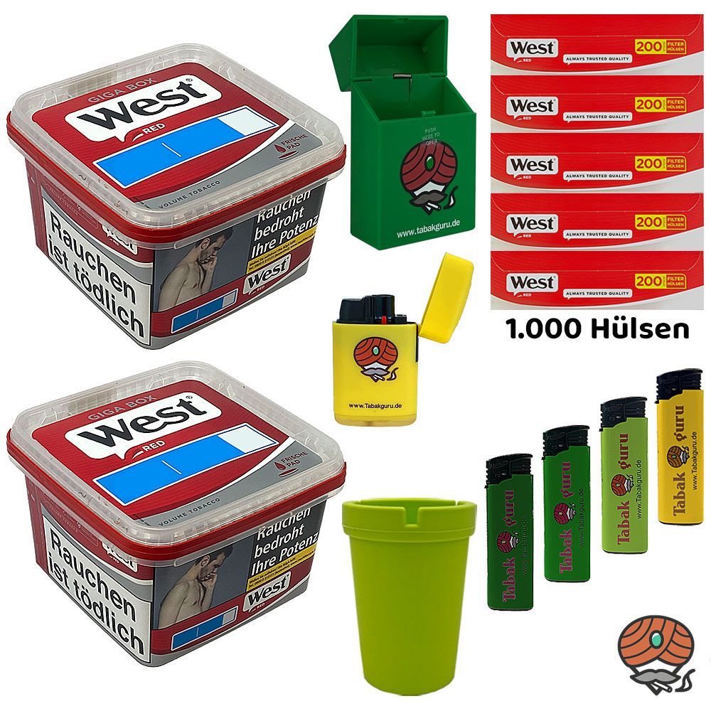 2 x West Red Rot Tabak Giga Box + 1.000 West Rot King Size Filterhülsen + 4 Feuerzeuge (nicht wählbar) + 1 Sturmfeuerzeug (nicht wählbar) + 1 Autoaschenbecher (nicht wählbar) + 1 Zigarettenbox (nicht wählbar) Tabak: West Red Volumentabak ist ein hochwertiger sehr ergiebiger Volumentabak Stopftabak,