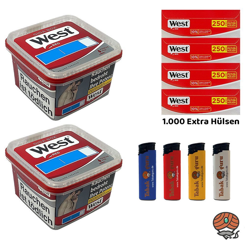 West Red Tabak/Volumentabak Giga Box 2x 160g, 1000 Extra Hülsen, Feuerzeuge