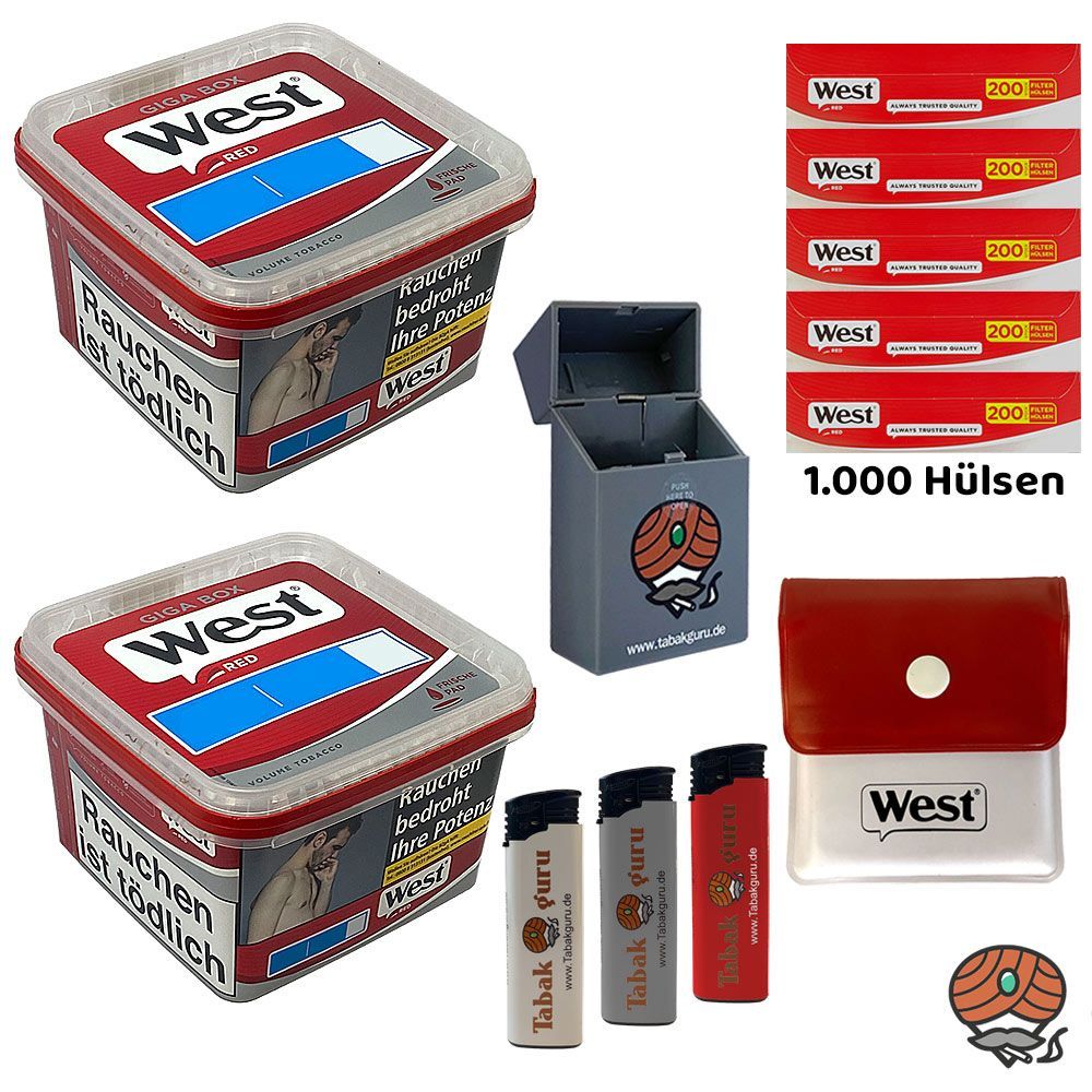 2 x West Red Rot Volumentabak Giga Box + 1.000 West Red King Size Filterhülsen + 3 Feuerzeuge (nicht wählbar) + 1 Zigarettenbox (nicht wählbar) + 1 Taschenaschenbecher mit West-Logo Tabak: West Red Volumentabak ist ein hochwertiger, sehr ergiebiger Volumentabak Stopftabak, der sich vor allem zum Sto