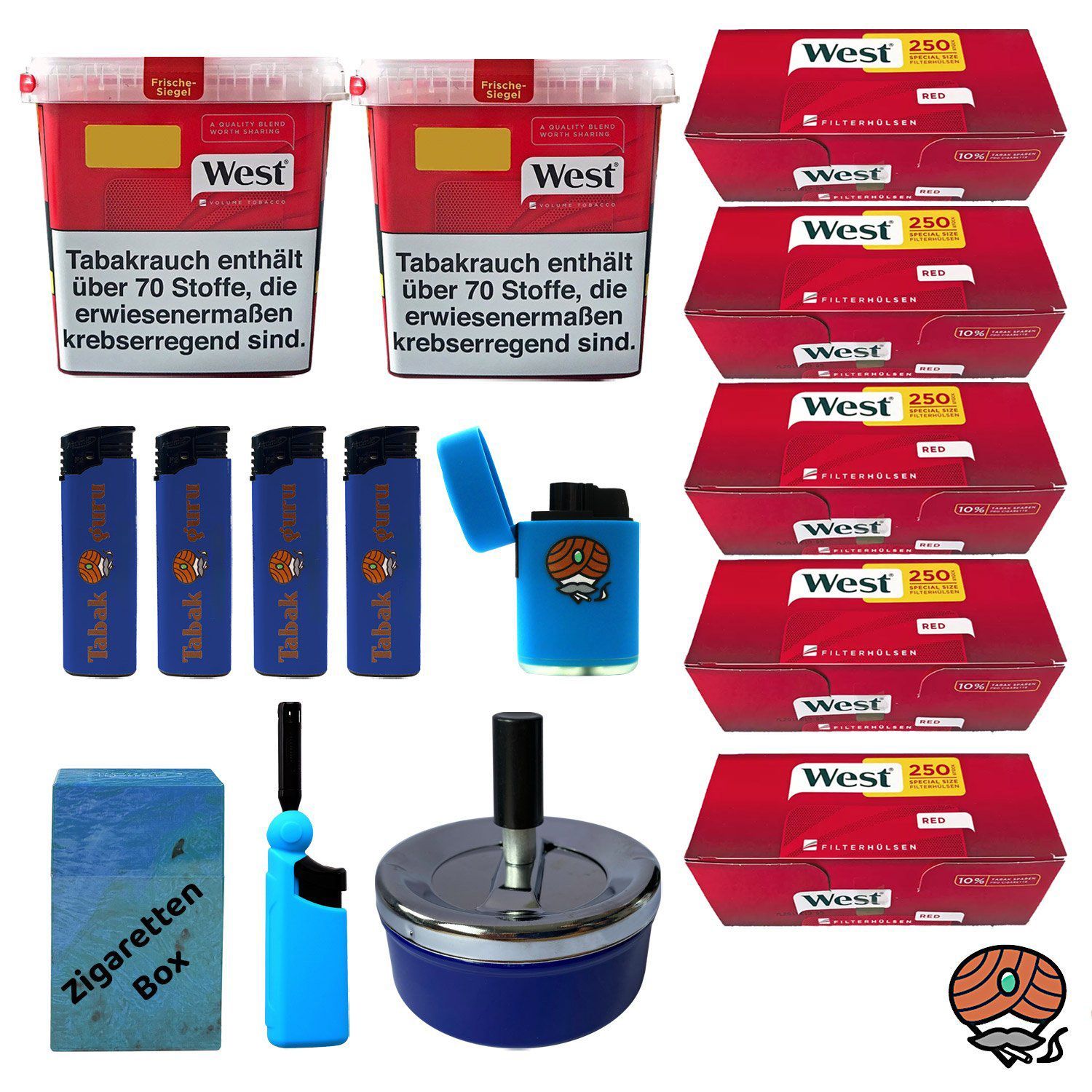 2 x West Red Rot Volumentabak Giga Box + 1.250 West Red Extra Filterhülsen + 4 Feuerzeuge (nicht wählbar) + 1 Jet-Flame- Sturm-Feuerzeug (nicht wählbar) + 1 Stab-Feuerzeug (nicht wählbar) + 1 Drehascher Schleuderaschenbecher (nicht wählbar) + 1 Zigarettenbox (nicht wählbar) Tabak: West Red Volumenta