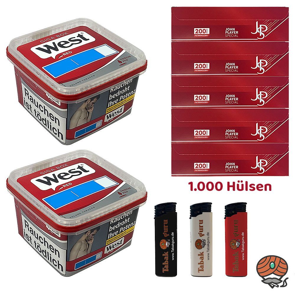 2 x West Red Rot Tabak Volumentabak Giga Box + 1.000 JPS John Player Special King Size Filterhülsen + 3 Feuerzeuge (nicht wählbar) Tabak: West Red Volumentabak ist ein hochwertiger sehr ergiebiger Volumentabak Stopftabak, der sich vor allem zum Stopfen von Zigaretten mit der Maschine eignet. Die Tab
