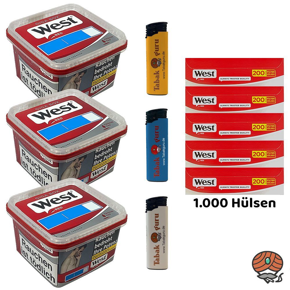 West Red Tabak/Volumentabak Giga Box 3x 160g, West Rot Hülsen, Feuerzeuge