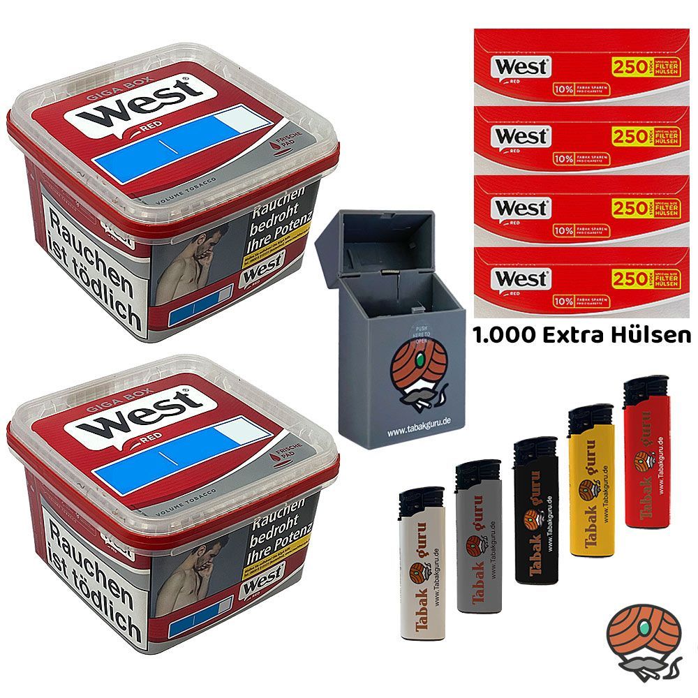 2 x West Red Rot Volumentabak Giga Box + 1.000 West Red Extra Filterhülsen + 5 Feuerzeuge (nicht wählbar) + 1 Zigarettenbox (nicht wählbar) Tabak: West Red Volumentabak ist ein hochwertiger sehr ergiebiger Volumentabak Stopftabak, der sich vor allem zum Stopfen von Zigaretten mit der Maschine eignet