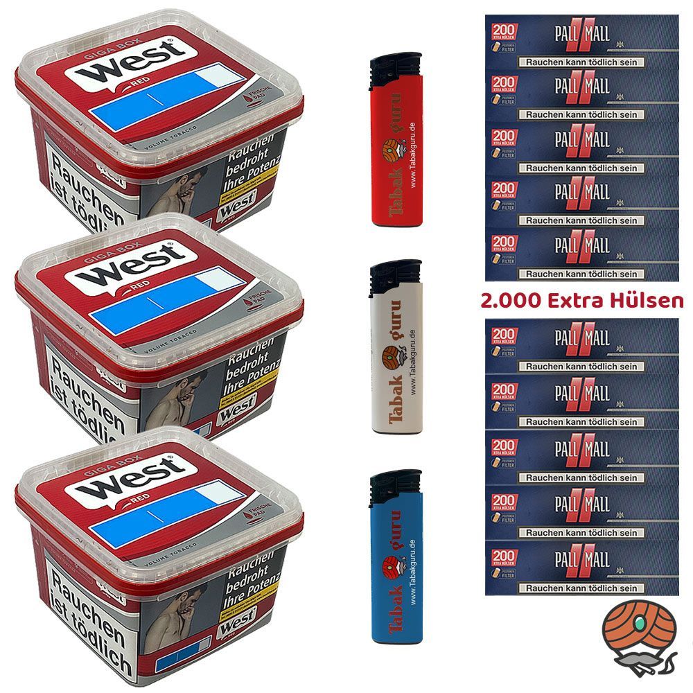 West Tabak/Volumentabak Giga Box 3x 160g, Pall Mall Hülsen, Feuerzeuge