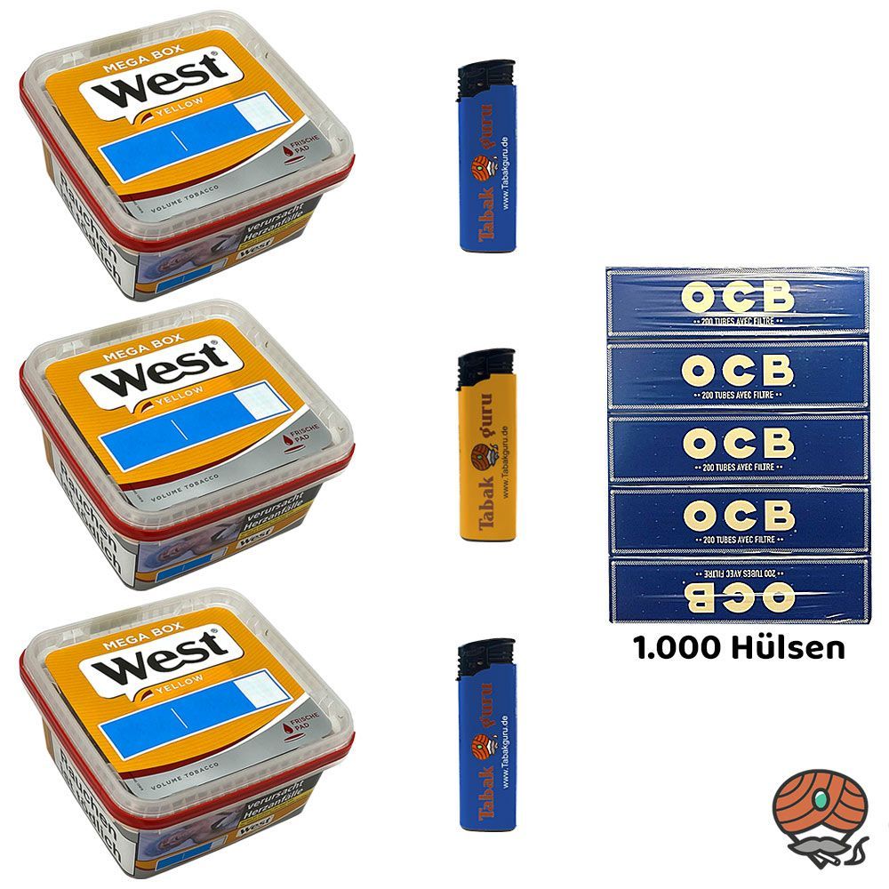 West Yellow Tabak Mega Box 3x 105g, OCB Blau Hülsen, Feuerzeuge