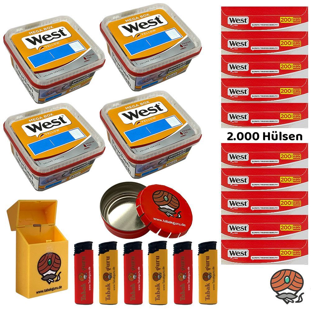 4 x West Yellow Volumentabak Mega Box + 2.000 West Red King Size Filterhülsen + 6 Feuerzeuge (nicht wählbar) + 1 Taschenaschenbecher (nicht wählbar) + 1 Zigarettenbox (nicht wählbar) Tabak: West Yellow Volumentabak ist ein hochwertiger sehr ergiebiger Volumentabak Stopftabak, der sich vor allem zum
