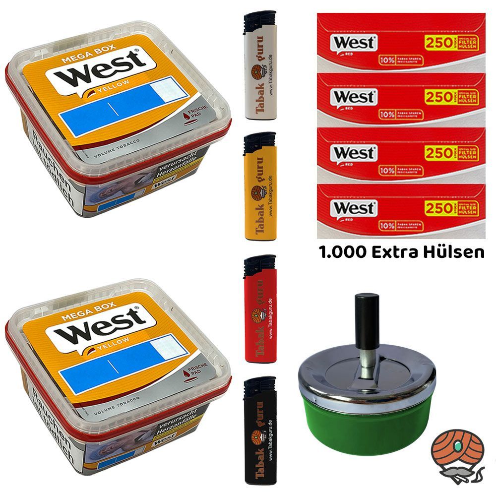 2 x West Yellow Volumentabak Mega Box + 1.000 West Red Extra Filterhülsen + 4 Feuerzeuge (nicht wählbar) + 1 Drehascher Schleuderaschenbecher (nicht wählbar) Tabak: West Yellow Volumentabak ist ein hochwertiger, sehr ergiebiger Volumentabak Stopftabak, der sich vor allem zum Stopfen von Zigaretten m