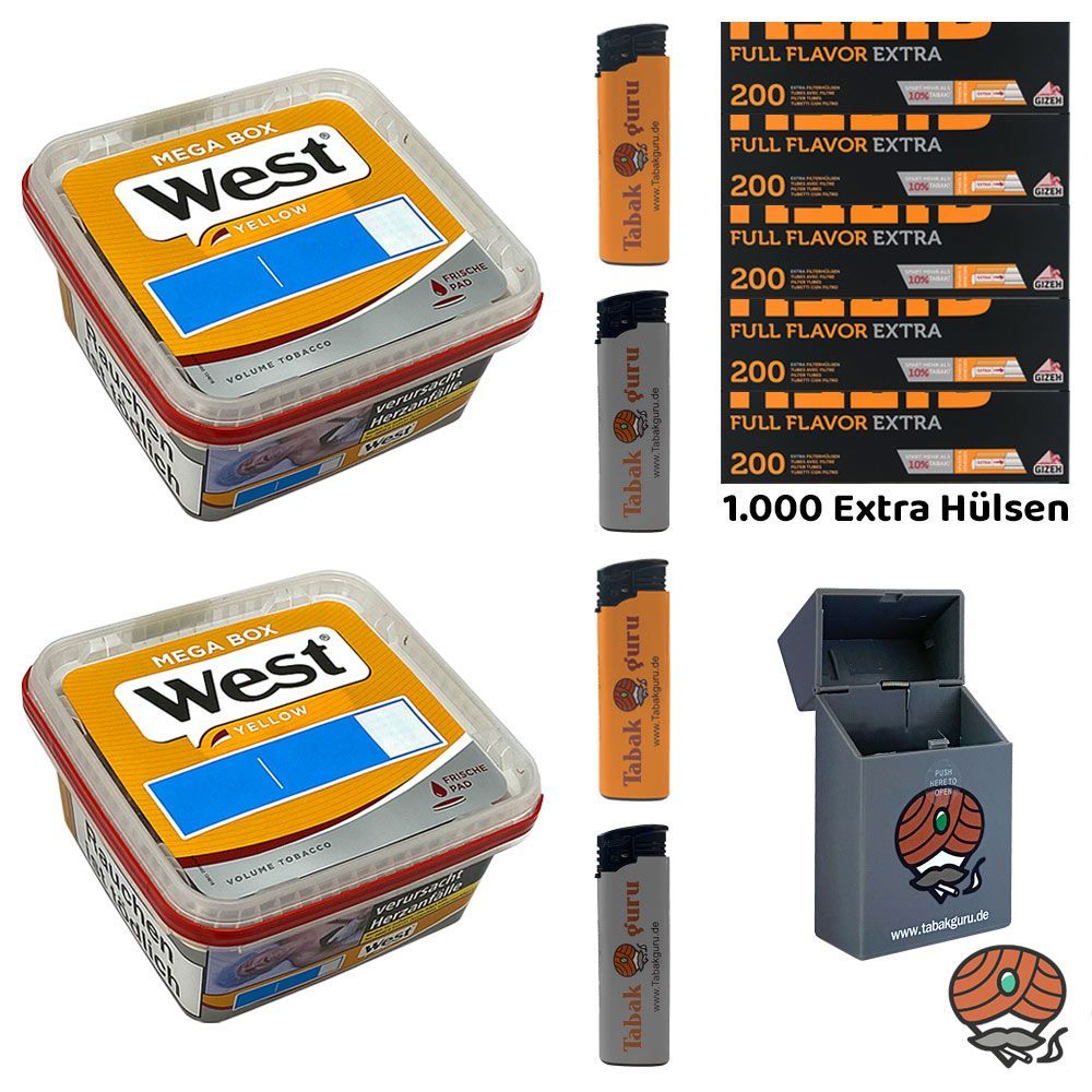 2 x West Yellow Volumentabak Mega Box + 1.000 Gizeh Full Flavor Extra Papier-Filterhülsen + 4 Feuerzeuge (nicht wählbar) + 1 Zigarettenbox (nicht wählbar) Tabak: West Yellow Volumentabak ist ein hochwertiger sehr ergiebiger Volumentabak Stopftabak, der sich vor allem zum Stopfen von Zigaretten mit d