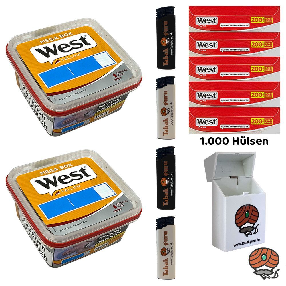 West Yellow Volumentabak Mega Box 2x 105g, 1000 Red West Hülsen, Feuerzeuge