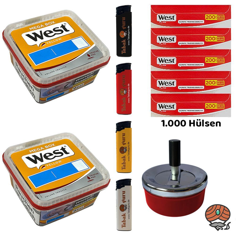 2 x West Yellow Volumentabak Mega Box + 1.000 West Red King Size Filterhülsen + 4 Feuerzeuge (nicht wählbar) + 1 Drehascher Schleuderaschenbecher (nicht wählbar) Tabak: West Yellow Volumentabak ist ein hochwertiger, sehr ergiebiger Volumentabak Stopftabak, der sich vor allem zum Stopfen von Zigarett