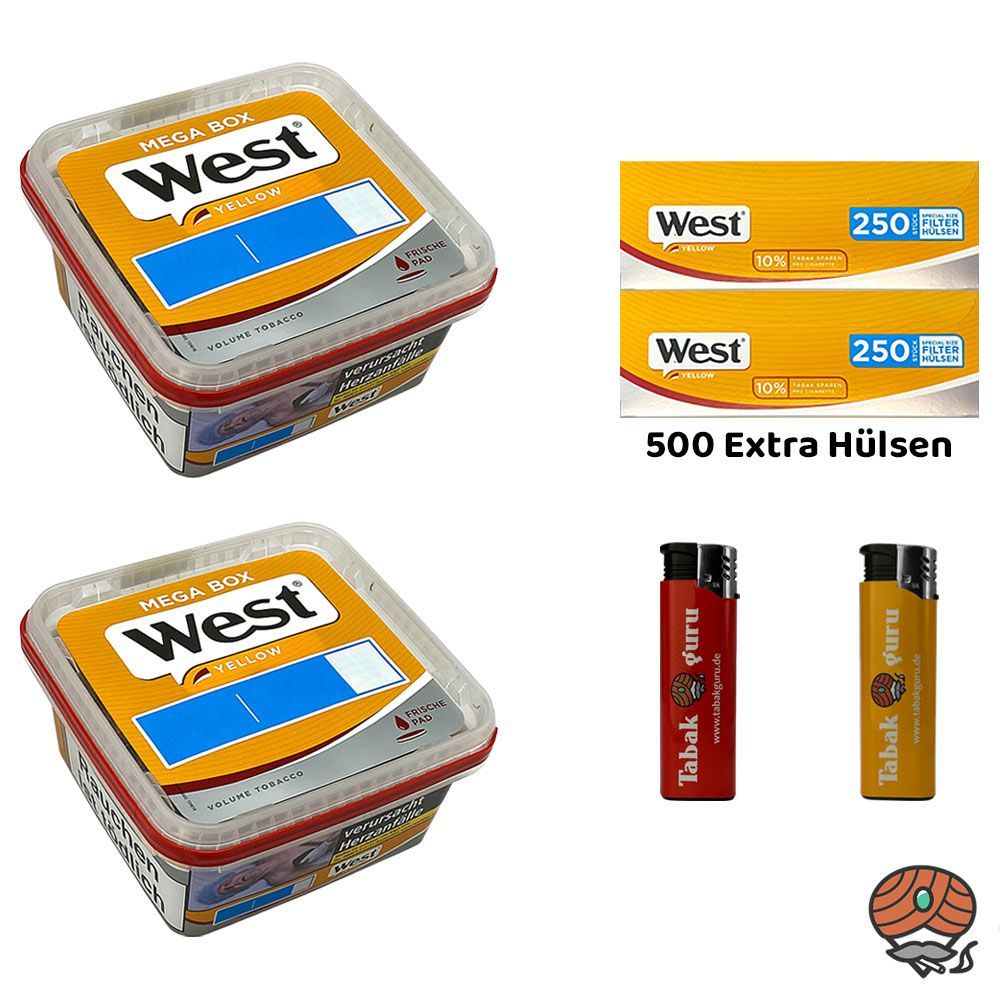 West Yellow Volumentabak Mega Box 2x 105g, 500 Extra Hülsen, Feuerzeuge