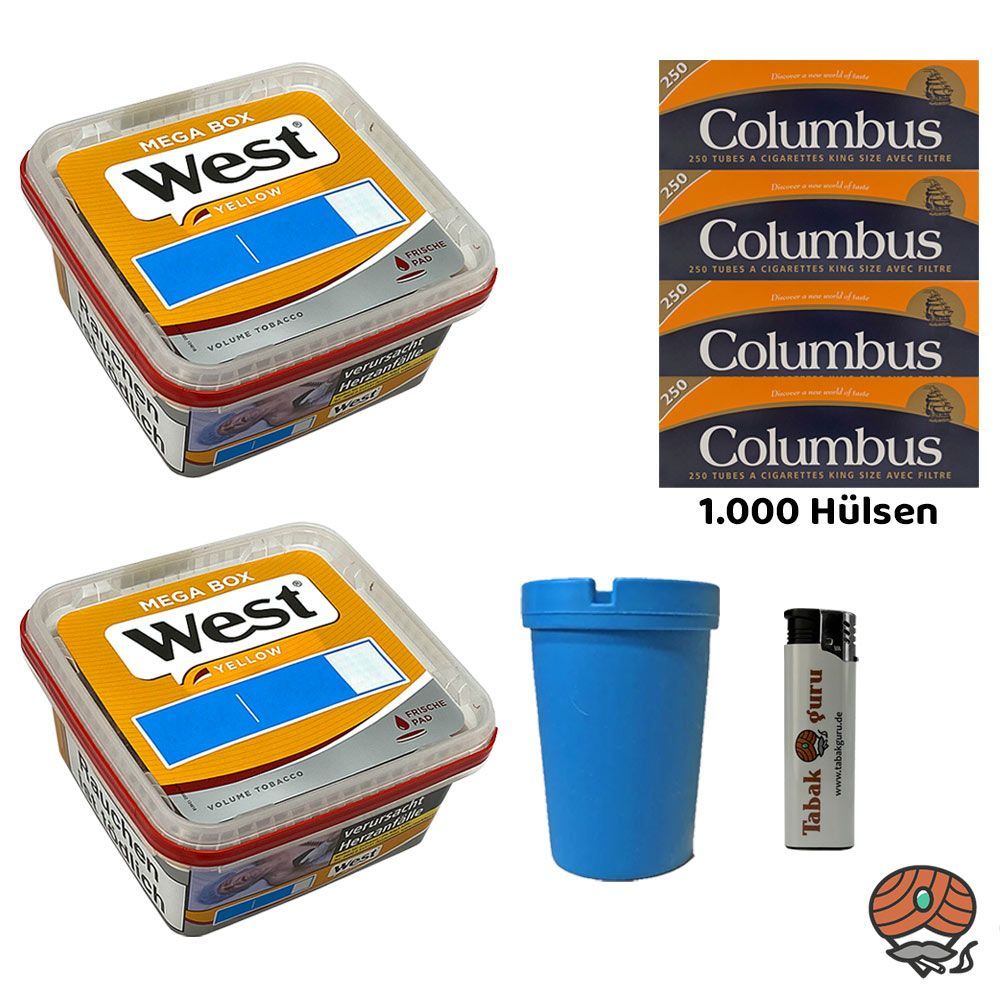 2 x West Yellow Volumentabak Mega Box + 1.000 Columbus King Size Filterhülsen + 1 Sturmfeuerzeug (nicht wählbar) + 1 Autoaschenbecher (nicht wählbar) Tabak: West Yellow Volumentabak ist ein hochwertiger sehr ergiebiger Volumentabak Stopftabak, der sich vor allem zum Stopfen von Zigaretten mit der Ma