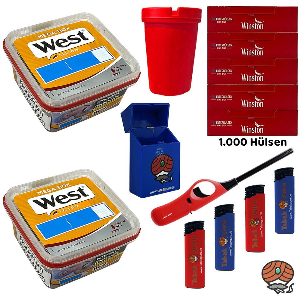 2 x West Yellow Volumentabak Mega Box + 1.000 Winston King Size Filterhülsen + 4 Feuerzeuge (nicht wählbar) + 1 Autoaschenbecher (nicht wählbar) + 1 Stabfeuerzeug (nicht wählbar) + 1 Zigarettenbox (nicht wählbar) Tabak: West Yellow Volumentabak ist ein hochwertiger, sehr ergiebiger Volumentabak Stop