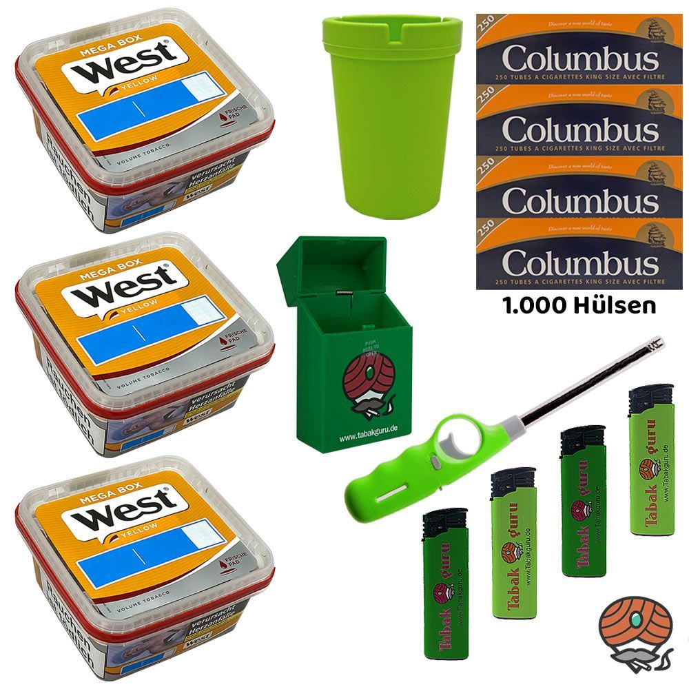 3 x West Yellow Volumentabak Mega Box + 1.000 Columbus King Size Filterhülsen + 4 Feuerzeuge (nicht wählbar) + 1 Stabfeuerzeug (nicht wählbar) + 1 Autoschenbecher (nicht wählbar) + 1 Zigarettenbox (nicht wählbar) Tabak: West Yellow Volumentabak ist ein hochwertiger, sehr ergiebiger Volumentabak Stop