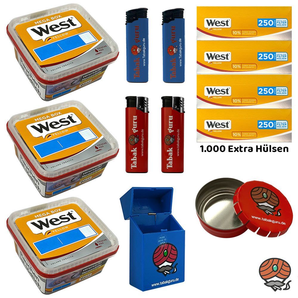 3 x West Yellow Volumentabak Mega Box + 1.000 West Yellow Extra Filterhülsen + 2 Feuerzeuge (nicht wählbar) + 2 Sturmfeuerzeuge (nicht wählbar) + 1 Taschenaschenbecher (nicht wählbar) + 1 Zigarettenbox (nicht wählbar) Tabak: West Yellow Volumentabak ist ein hochwertiger sehr ergiebiger Volumentabak