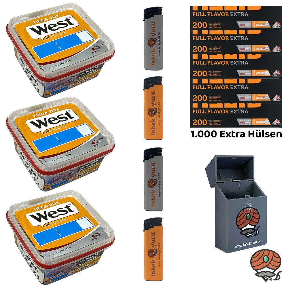 3 x West Yellow Volumentabak Mega Box + 1.000 Gizeh Full Flavor Extra Papier-Filterhülsen + 4 Feuerzeuge (nicht wählbar) + 1 Zigarettenbox (nicht wählbar) Tabak: West Yellow Volumentabak ist ein hochwertiger, sehr ergiebiger Volumentabak Stopftabak, der sich vor allem zum Stopfen von Zigaretten mit