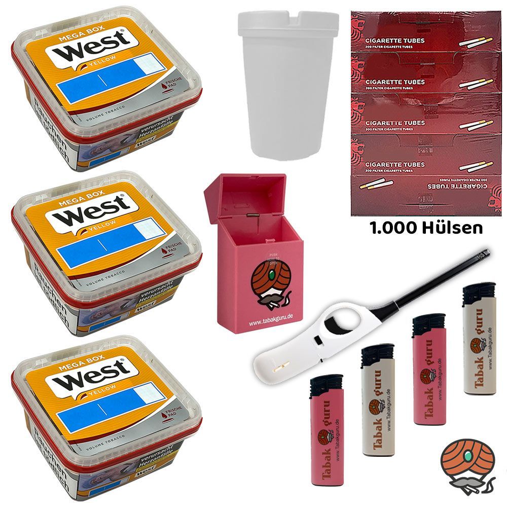 West Yellow Volumentabak Mega Box 3x 105g + 1000 Hülsen + Stabfeuerzeug
