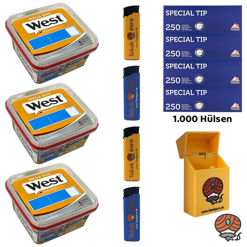 West Yellow Volumentabak Mega Box 3x 105g, Gizeh Special Tip Hülsen, Zubehör