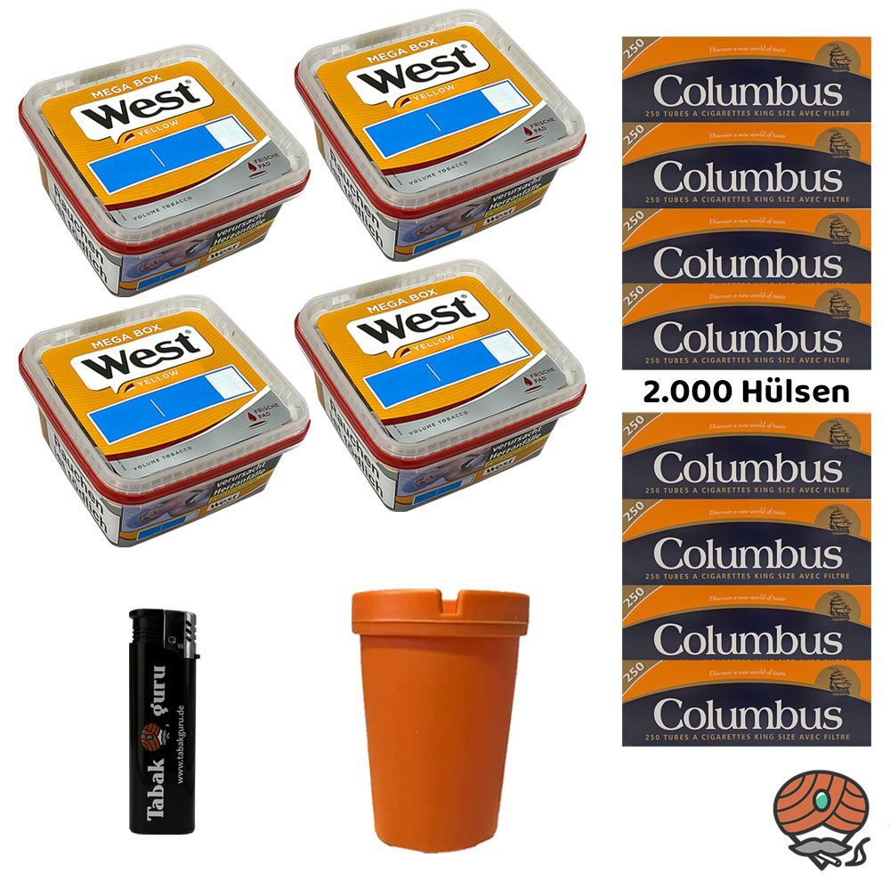West Yellow Volumentabak Mega Box 4x 105g, 2000 Columbus Hülsen, Feuerzeug