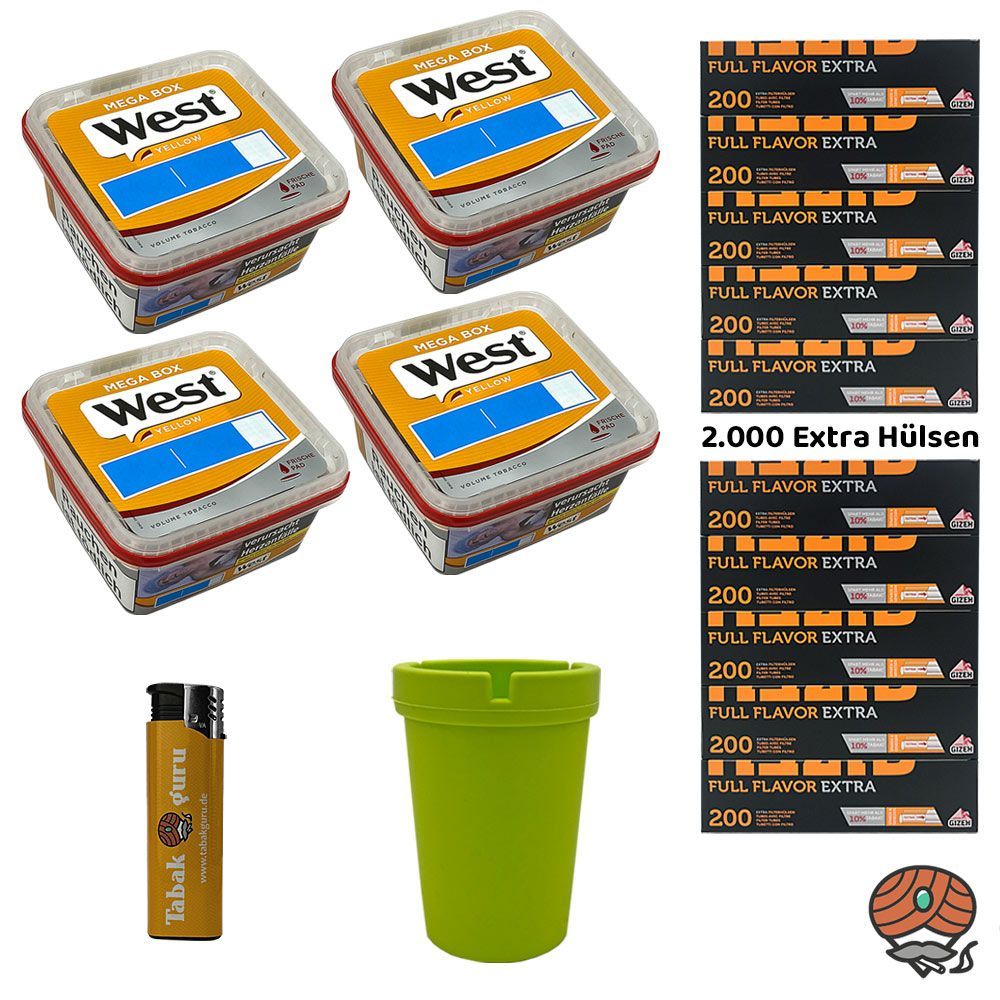 4 x West Yellow Volumentabak Mega Box + 2.000 Gizeh Full Flavor Extra Papier-Filterhülsen + 1 Sturmfeuerzeug (nicht wählbar) + 1 Autoaschenbecher (nicht wählbar) Tabak: West Yellow Volumentabak ist ein hochwertiger, sehr ergiebiger Volumentabak Stopftabak, der sich vor allem zum Stopfen von Zigarett