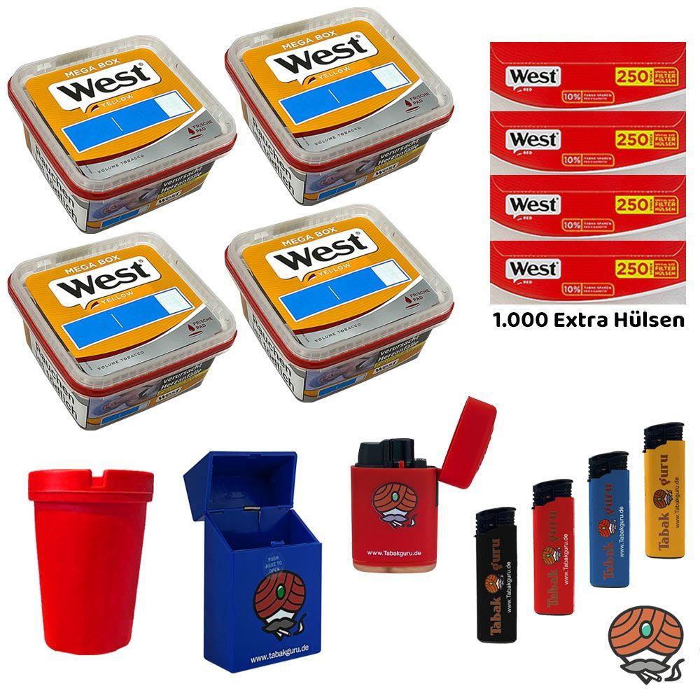 4 x West Yellow Volumentabak Mega Box + 1.000 West Rot Extra Filterhülsen + 4 Feuerzeuge (nicht wählbar) + 1 Sturmfeuerzeug (nicht wählbar) + 1 Autoaschenbecher (nicht wählbar) + 1 Zigarettenbox (nicht wählbar) Tabak: West Yellow Volumentabak ist ein hochwertiger sehr ergiebiger Volumentabak Stopfta