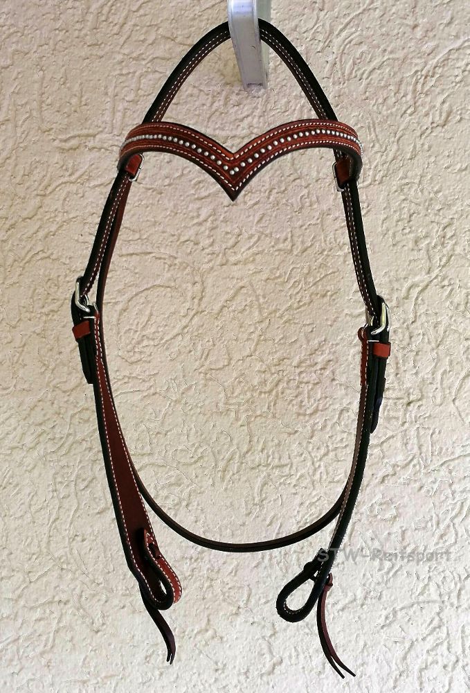 Trense aus Harnessleder mit aufwändigen Punzierungen und Dots. Stirnriemen V-förmig. Gebissbefestigung mittels Knoten. Größe Vollblut (Cob).