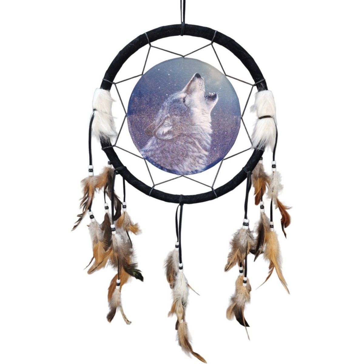 Western Traumfänger schwarz mit heulendem Wolf auf Felsen