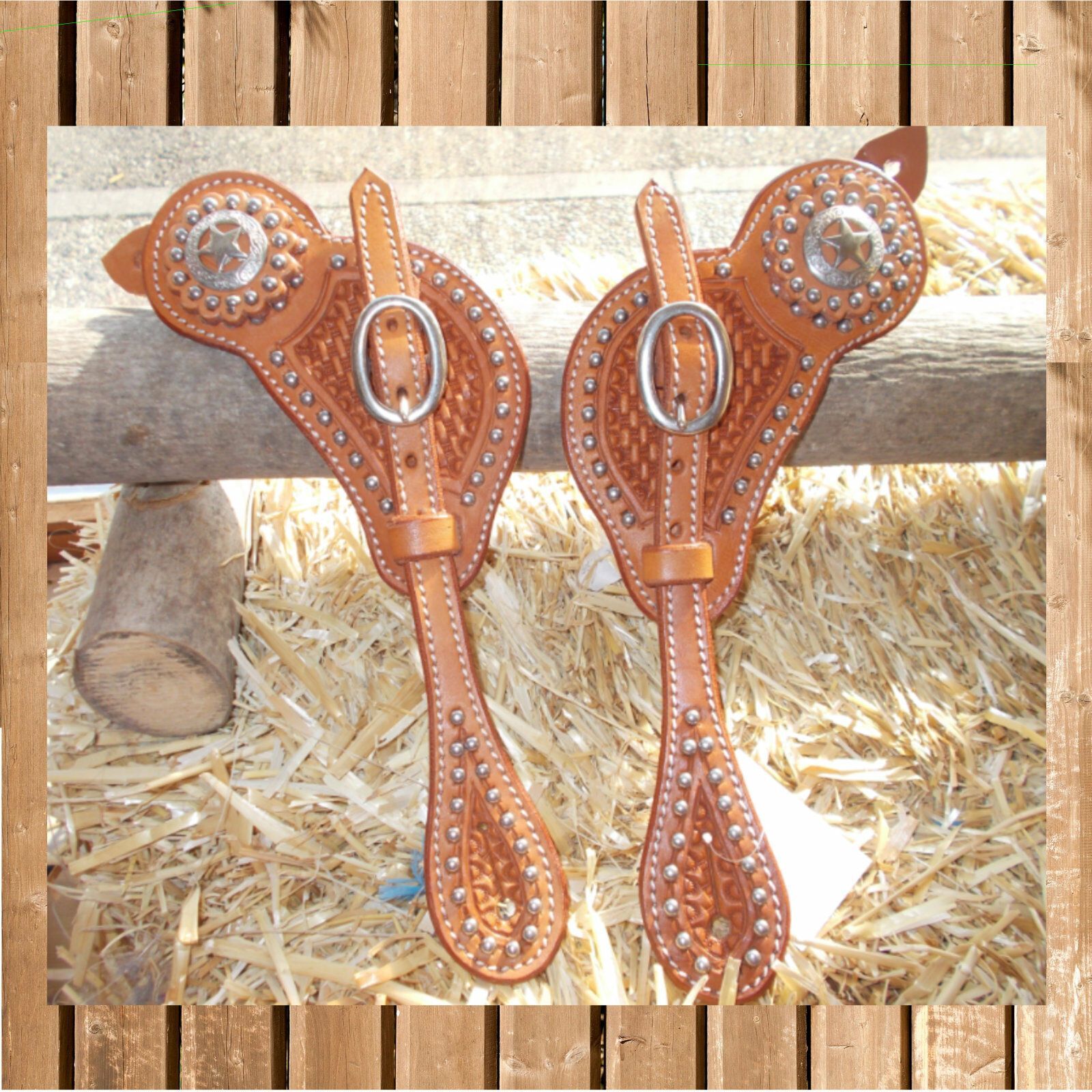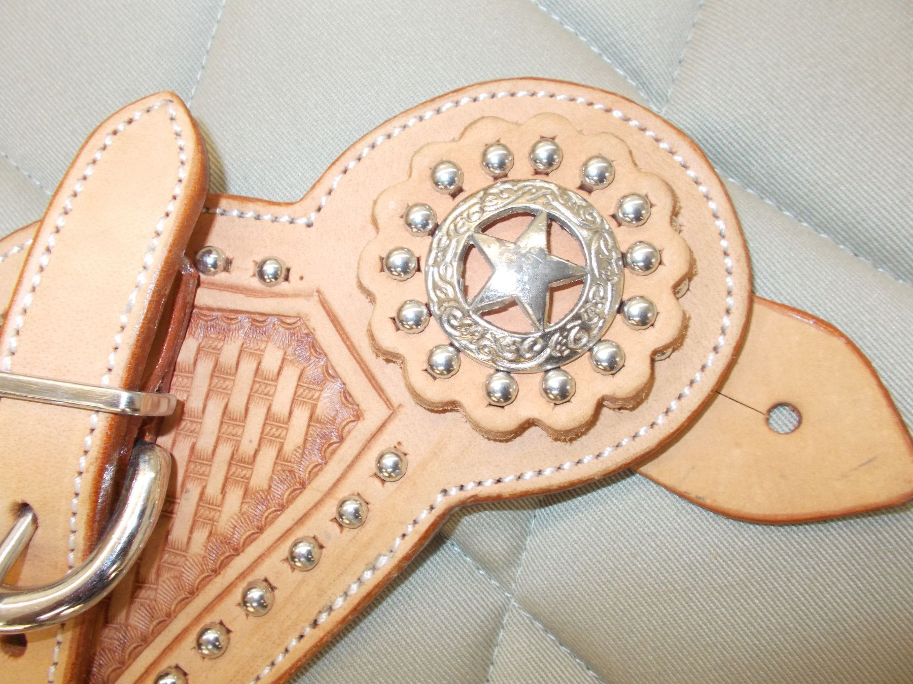 Wildhorn Westernsporenriemen Dots Concho Stern Motiv punziertes hochwertiges Leder Mit Edelstahl Dots verziert Bitte beachten - bei dem rechten Sporenriemen (Bild 2) ist der Concho etwas abgeplatzt - deshalb Sonderpreis Bildschirmfarben können bei Tageslicht anderst wirken