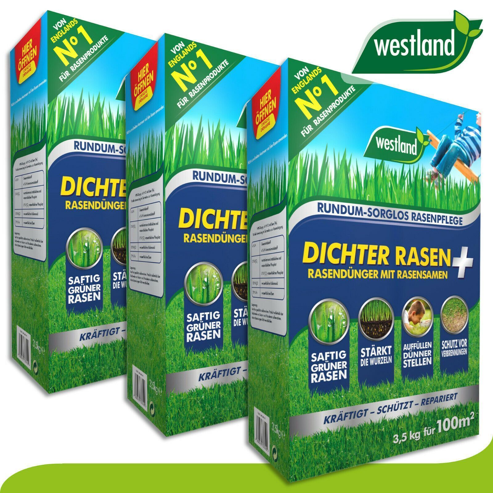Westland 3 x 3,5 kg Dichter Rasen ? Rasendünger mit Rasensamen »Englands Nr 1«