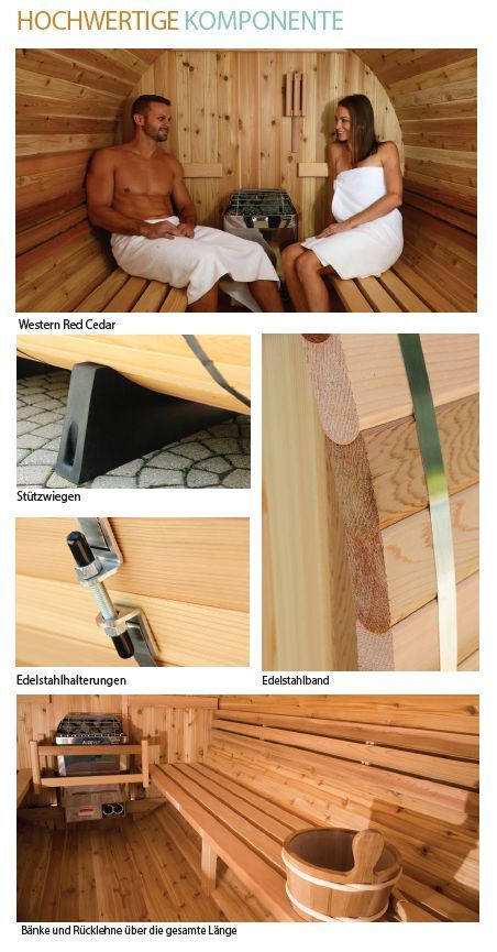 WESTON FASSSAUNA aus Kanadische Western Red Cedar 1829mm x 2438mm Kapazität: 6 Personen Saunagröße: 1829mm x 2438mm Raumlänge: 1981 mm Empfohlene Ofenheizleistung: 6 kW 8 GUTE GRÜNDE FÜR EINE FASSSAUNA SCHNELLE AUFHEIZZEITEN Die optimierte Bauform des Saunafasses und die guten Isoliereigenschaften v