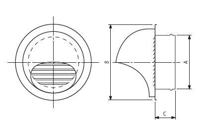 Wetterschutzgitter aus Edelstahl Ø 150 mm Produktinformation Wetterschutz mit halbkugelförmiger Abschirmung zum Schutz vor dem Einblasen von Luft und schrägen Federblättern, die den Luftstrom nach unten richten. Mit zusätzlichem Schutzgitter, damit keine Insekten eindringen können. Einfache M