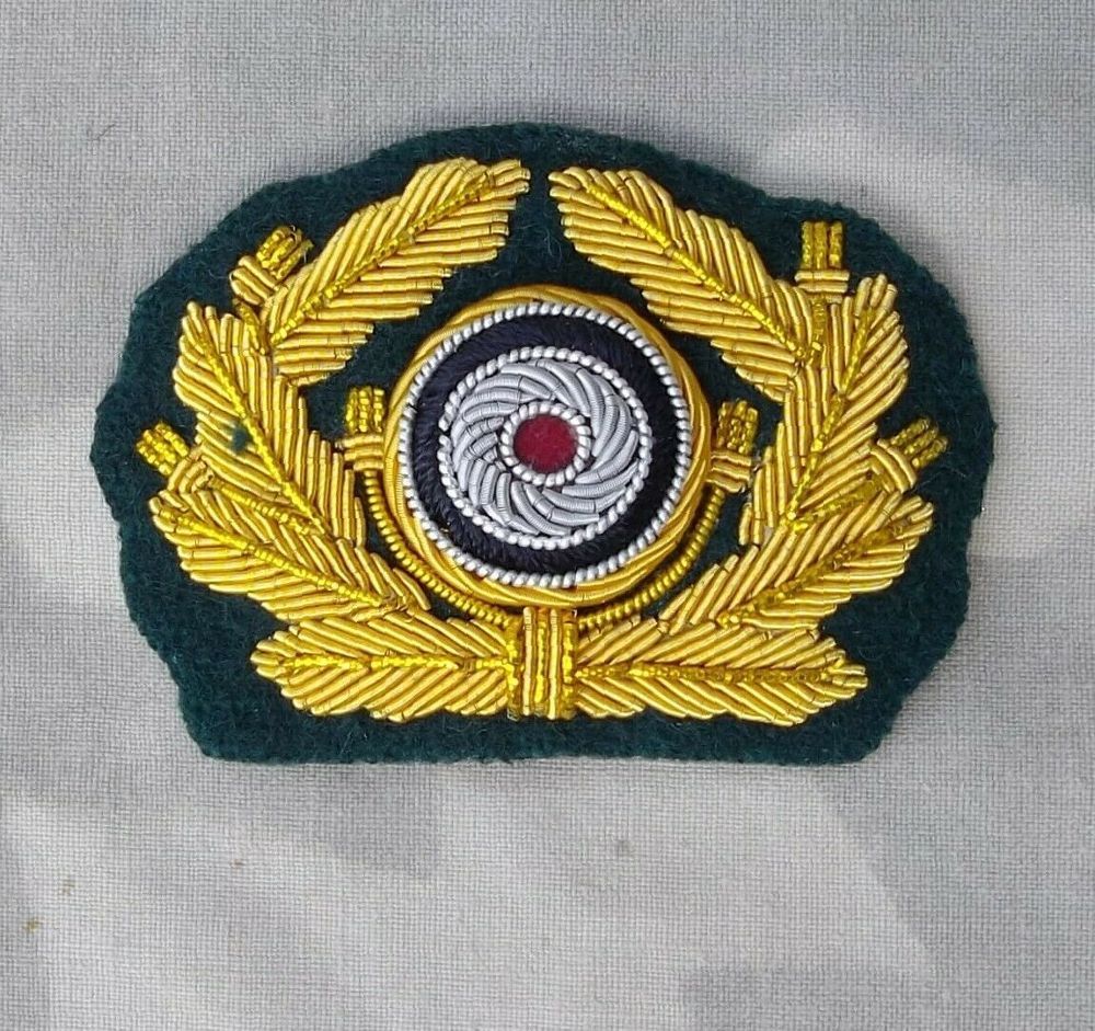 WH Schirmmützen Abzeichen General Schirmmützenabzeichen für Generäle der Wehrmacht im 2. Weltkrieg. Handgestickte Ausführung, hochwertige Sammleranfertigung. Eichenblattkranz & Kokarde auf dunkelgrünem Grund. Material: Baumwolle Metallfaden. Größe ca. 6,5 x 4,6 cm (B x H)