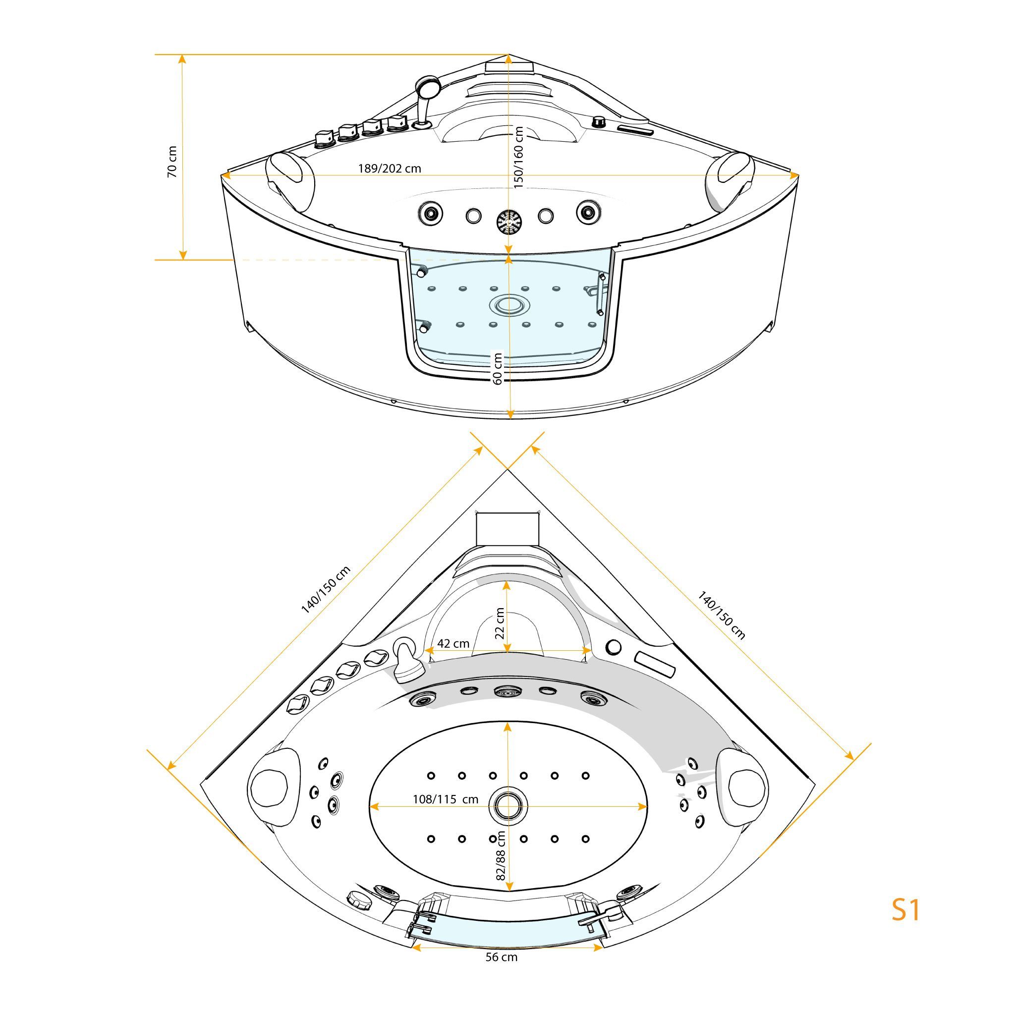 Whirlpool Pool Badewanne Eckwanne Wanne W60H-TH-ALL 140x140cm mit Tür Walk-in-Pool